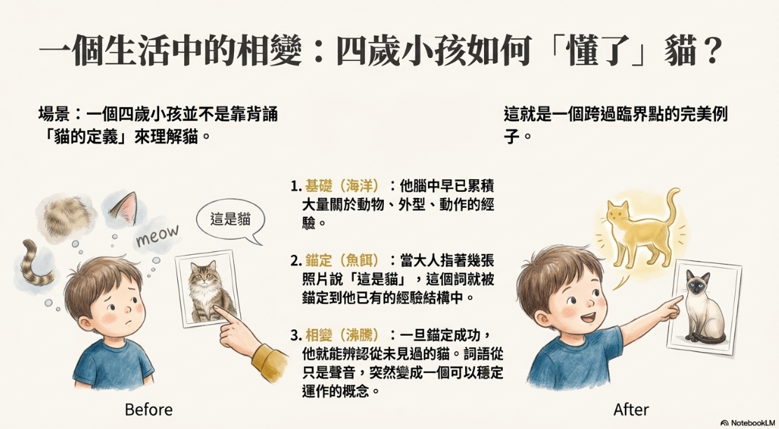 為了讓這個抽象理論更容易理解,作者舉了一個非常生活化的例子:四歲小孩學會什麼是「貓」:小孩並不是靠背誦定義來理解貓,而是因為他早已累積了大量關於動物、外型、動作與聲音的經驗。當大人給他看幾張貓的照片,並告訴他「這是貓」,這個詞就被錨定到他原本就存在的一整片經驗結構中。一旦錨定成功,他就能辨認從未見過的貓,而且判斷會變得非常穩定。這正是一個跨過臨界點的例子:在那之前,詞語只是聲音;在那之後,它突然變成一個可以穩定運作的概念。