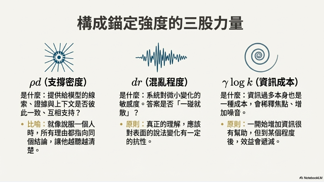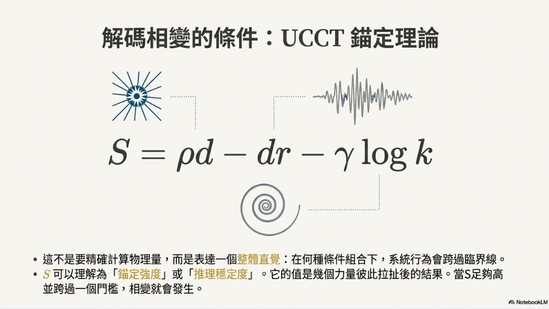 這個公式並不是要精確計算什麼物理量,而是用來表達一個整體直覺:在某個條件組合之下,系統的行為會跨過一條臨界線,從不穩定、容易亂猜的狀態,切換成相對穩定、目標導向的推理狀態。S 可以被理解為「錨定強度」或「推理穩定度」,它不是單一因素造成的,而是幾個力量彼此拉扯後的結果 :