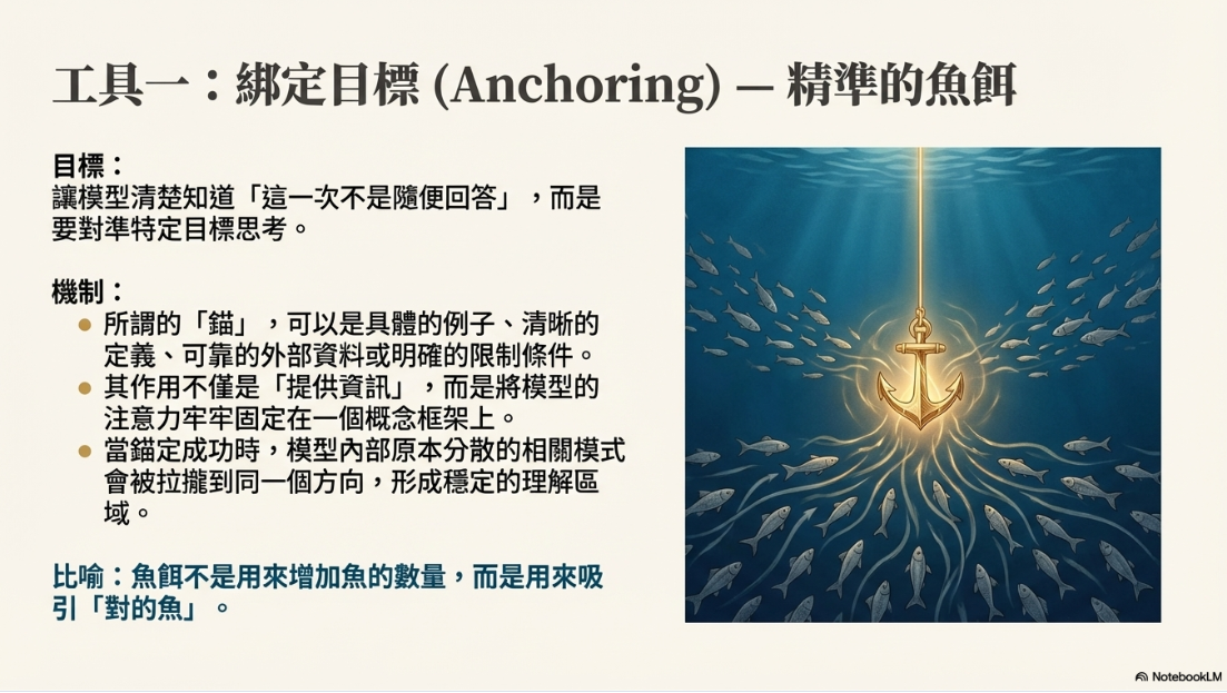 所謂「錨定」,可以來自很多形式,例如具體的例子、清楚的定義、可靠的外部資料、工具運算的結果,或明確指出的限制條件。這些東西的作用,不是單純「給資訊」,而是把模型的注意力,牢牢固定在某一個概念或問題框架上。作者用「放魚餌」來形容這件事:魚餌不是用來增加魚的數量,而是用來吸引對的魚。當錨定成功時,模型內部原本分散的相關模式,會被拉攏到同一個方向,形成一個相對穩定的理解區域。