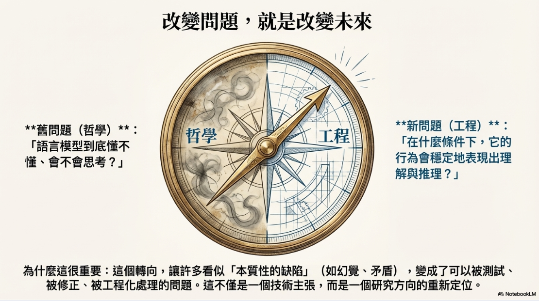 這篇文章之所以重要,不只是因為它為語言模型辯護,而是因為它徹底改變了問題的問法。與其一直問「語言模型到底懂不懂、會不會思考」,作者建議我們改問:「在什麼條件下,它的行為會穩定地表現出理解與推理?」這樣的轉向,讓許多看似「本質性的缺陷」,變成可以被測試、被修正、被工程化處理的問題。也正因如此,這篇論文不只是技術主張,而是一個研究方向的重新定位