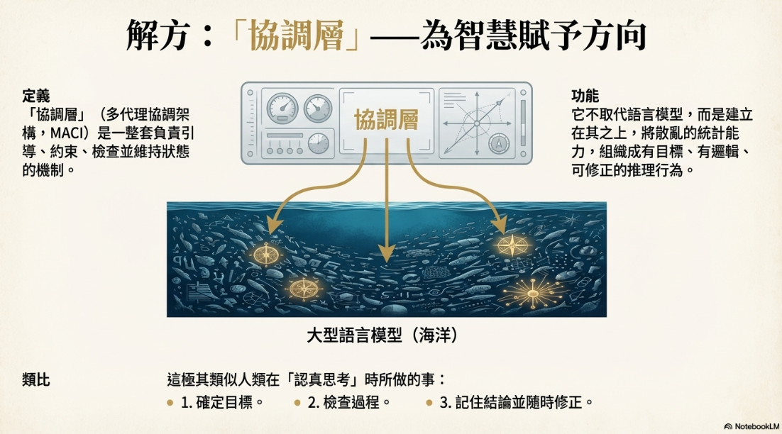 在作者的理解中,大型語言模型本身並不是「不聰明」,而是「沒有方向感」。它像一個反應極快、記憶力驚人、但不知道此刻該做什麼的系統。你問什麼,它就依照最可能的路徑往下接,但它不會自己判斷「這次回答是不是該更謹慎」、「是不是需要查證」、「是不是前後矛盾了」。因此,作者提出「協調層」這個概念,用來指一整套負責引導、約束、檢查並維持狀態的機制,名為「多代理協調架構」(MACI)。協調層不是取代語言模型,而是建立在語言模型之上,讓原本散亂的統計能力,能被組織成有目標、有邏輯、可修正的推理行為。