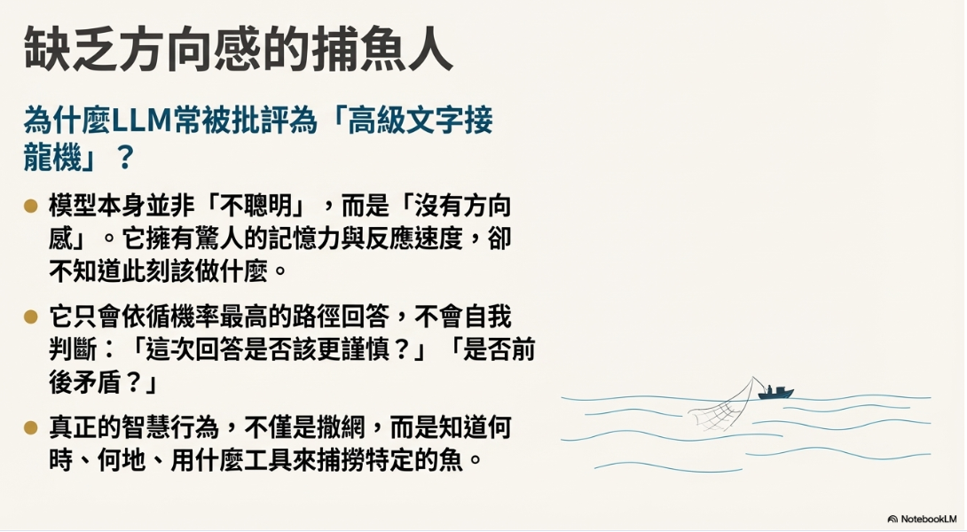為了讓一般人理解他的觀點,作者使用了一個非常直觀的比喻。他把大型語言模型比作一片巨大的海洋,海裡充滿各式各樣的魚。這些魚代表模型在訓練過程中學到的所有語言模式、知識結構與常見回答。其中,最常見、最普通的魚數量最多,而真正稀有、有針對性、需要精準理解才能抓到的魚則非常少。如果你只是隨意把漁網丟進海裡,沒有放魚餌,也沒有設計網子的密度,那麼撈上來的幾乎一定是那些最常見的魚。這正好對應到語言模型在缺乏明確目標與約束時,所產生的那些「聽起來合理、但其實很普通」的回答。作者強調,這並不是模型出錯,而是它忠實地反映了自身的統計結構。真正的智慧行為,不只是撒網,而是知道什麼時候該放魚餌、放多少、用多密的網,並且判斷值不值得再嘗試一次。