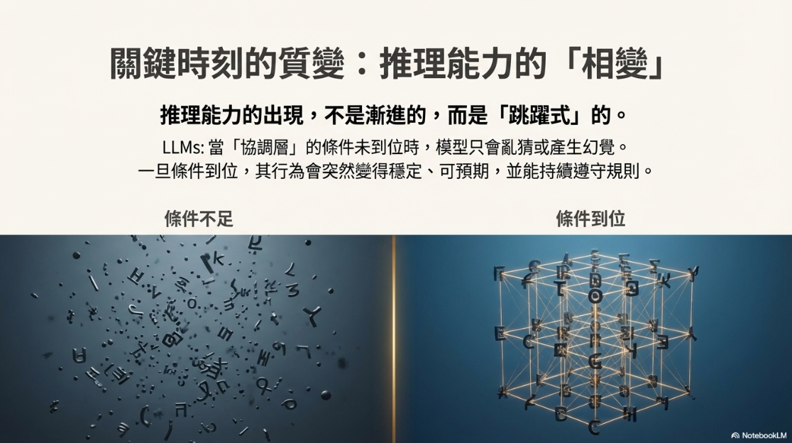 這正是作者所說的「相變」。推理不是慢慢多一點點,而是當條件齊備時,整個運作模式切換了。這個公式的價值,不在於精算,而在於提醒研究者:與其爭論模型「本質上會不會思考」,不如認真設計那些能讓系統跨過臨界點的條件