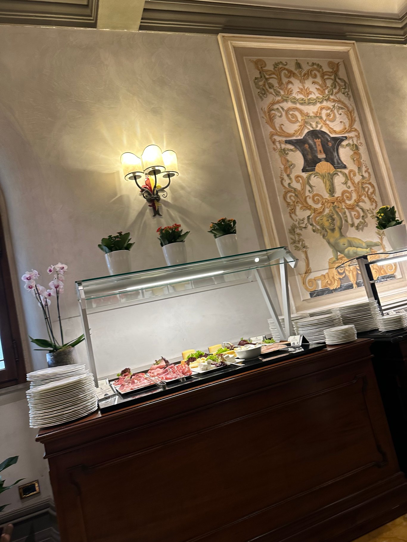 因为酒店建的时期比较早,酒店的房间内并没有咖啡机。所以酒店就额外提供早起点咖啡的服务。某生每天都起得很早,到意大利旅行也不例外。所以他一早就打电话到酒店的客房服务,点了两杯卡布奇诺咖啡。酒店还配带送两个小糕点给你配咖啡吃。真是一早就让你来个血糖飙升兴奋一下。