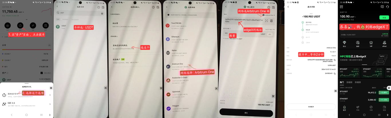 【注意】提币时务必选择Arbitrum链,地址为edgeX地址,USDT数量大于100美元(约700元人民币)。