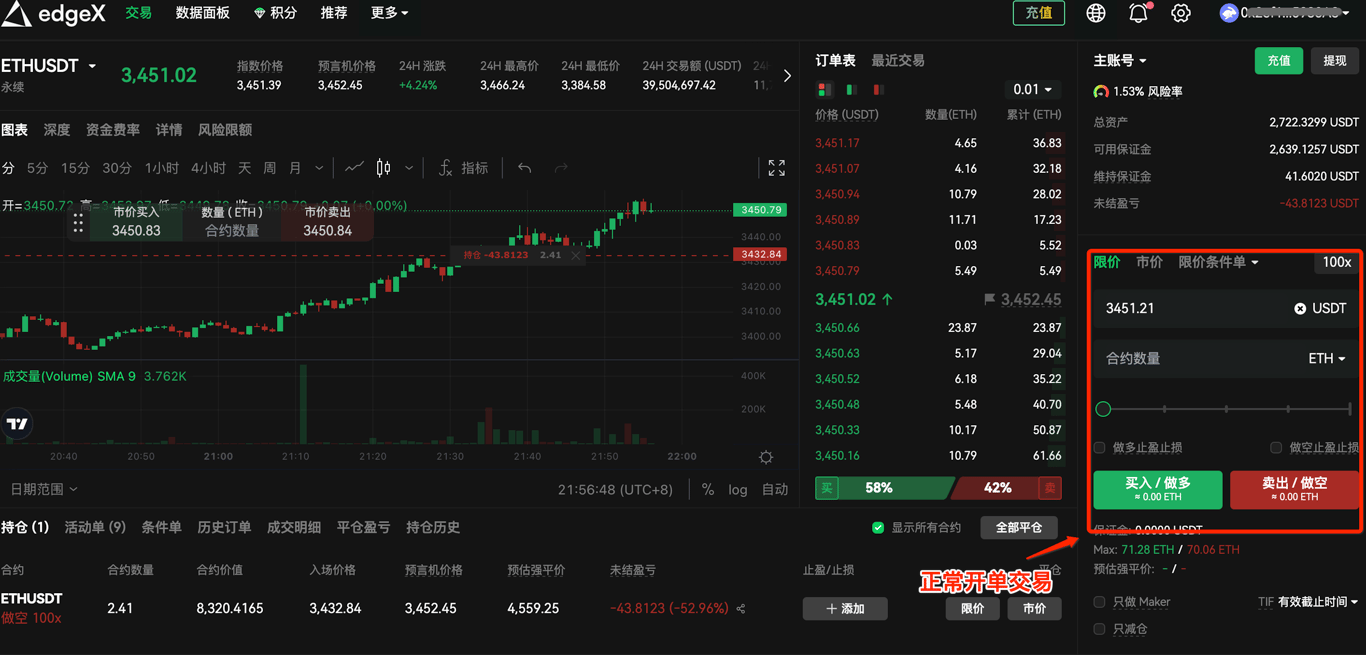 充值到账后即可交易。设置杠杆倍数(最高100倍),选择方向(买入/做多或卖出/做空)。注意风险:交易虽有积分空投,但需支付手续费且可能损失本金,避免过度投入。