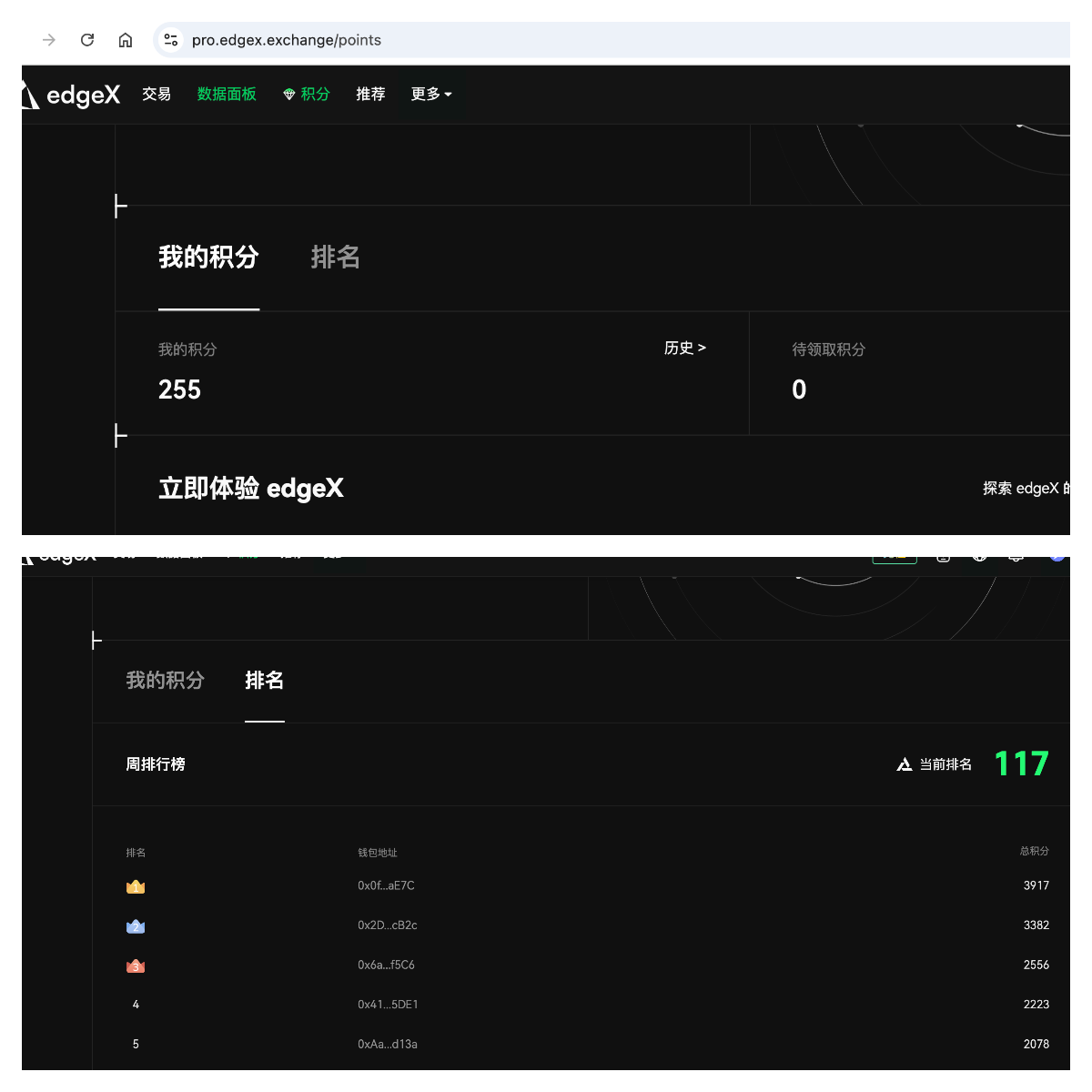 点击顶部“积分”栏查看交易积分。积分每周三(UTC时区)更新,显示周交易总额、积分及排名。当前用户较少,正常交易可获可观积分(例如225积分,排名117),手续费损失约5美元,性价比较高。