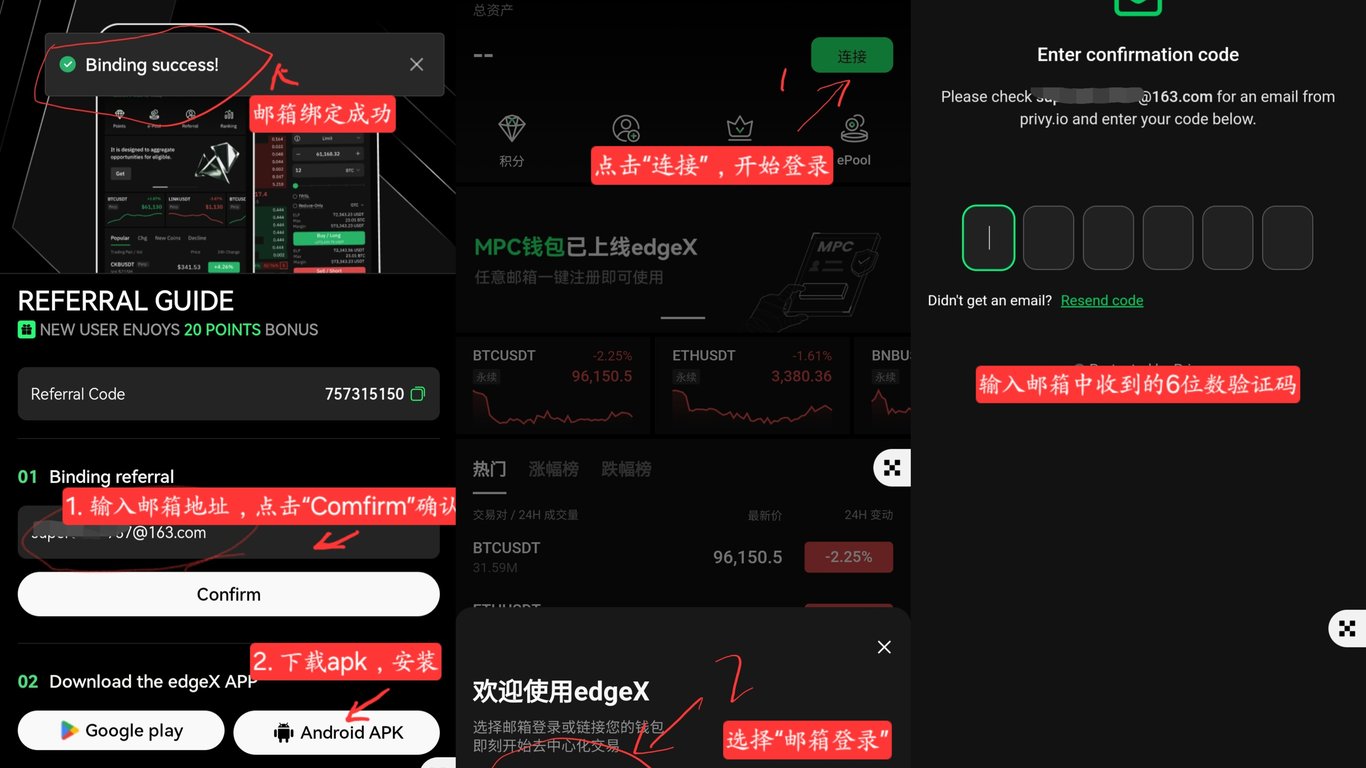 在手机浏览器中打开官网,注意,必须使用手机浏览器,电脑端可能无法显示邮箱输入框。 1. 输入常用邮箱,点击“Confirm”按钮——>输入邮箱收到的6位数验证码,完成注册。 2. 点击底部“Android APK”下载安装包,按提示安装App。iOS用户需先下载TestFlight,再安装试用包。 3. 安装后,点击首页“连接”,选择“邮箱登录”。