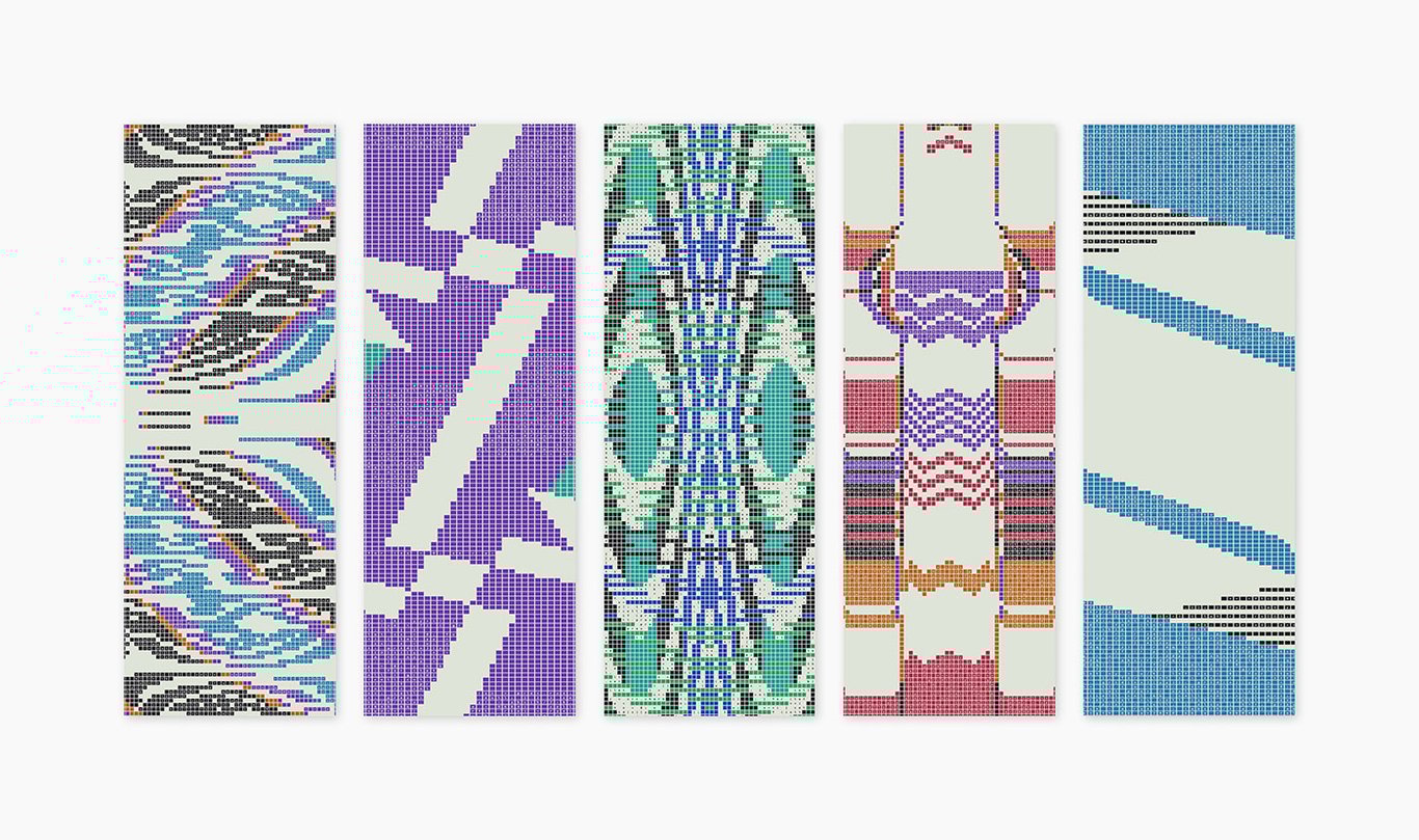 在形式上,Quine 將整份程式碼以 78×148 的格子呈現,模仿程式設計師常用的垂直長螢幕比例。程式碼並不是藏在背面,而是作為主體佈滿畫面,並以「liminal」與「sub-liminal」兩種狀態呈現:落在色塊外的字元是 liminal,進入色格中的就是 sub-liminal。這些格子由純黑、純白與十種色彩組成。Watkinson 指出,這是 Larva Labs 第一次以「抽象色彩」進行設計,而非像 CryptoPunks 或 Meebits 那樣由物件形象決定配色。此時色彩不再擬真,而是服務於結構,形成一種介於 code listing、織品設計與早期電視測試圖之間的視覺語彙。