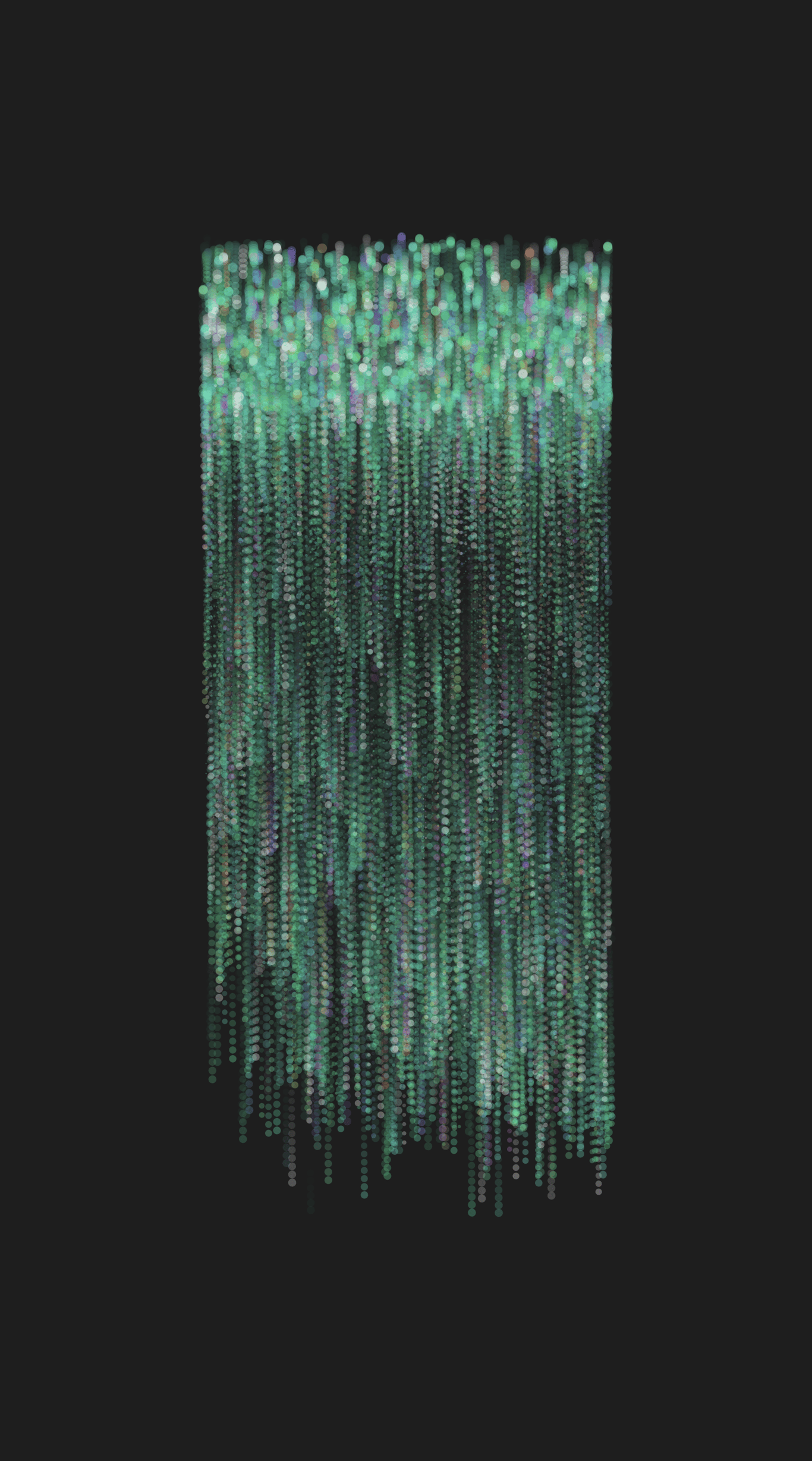 作品練習八是一件我非常喜歡的延伸練習,將粒子系統玩得更進一步。透過把畫面、粒子起點和流動方向進一步設計,打造有點像是瀑布的動態效果。甚至能拿來當個人網頁的首頁圖片,非常有意思!