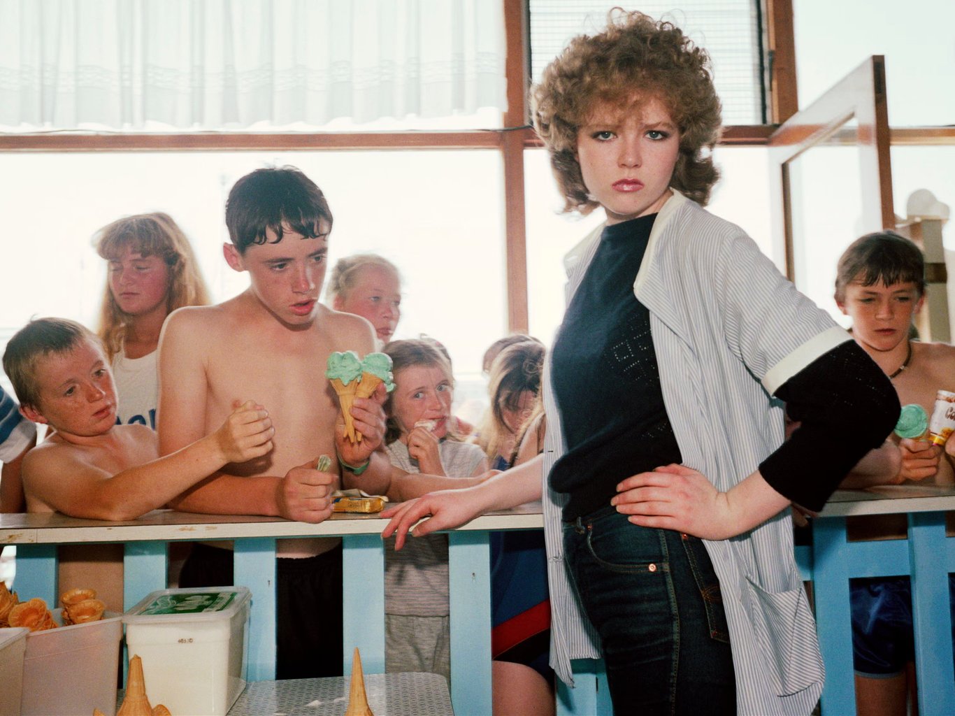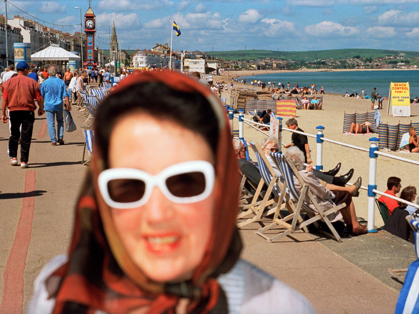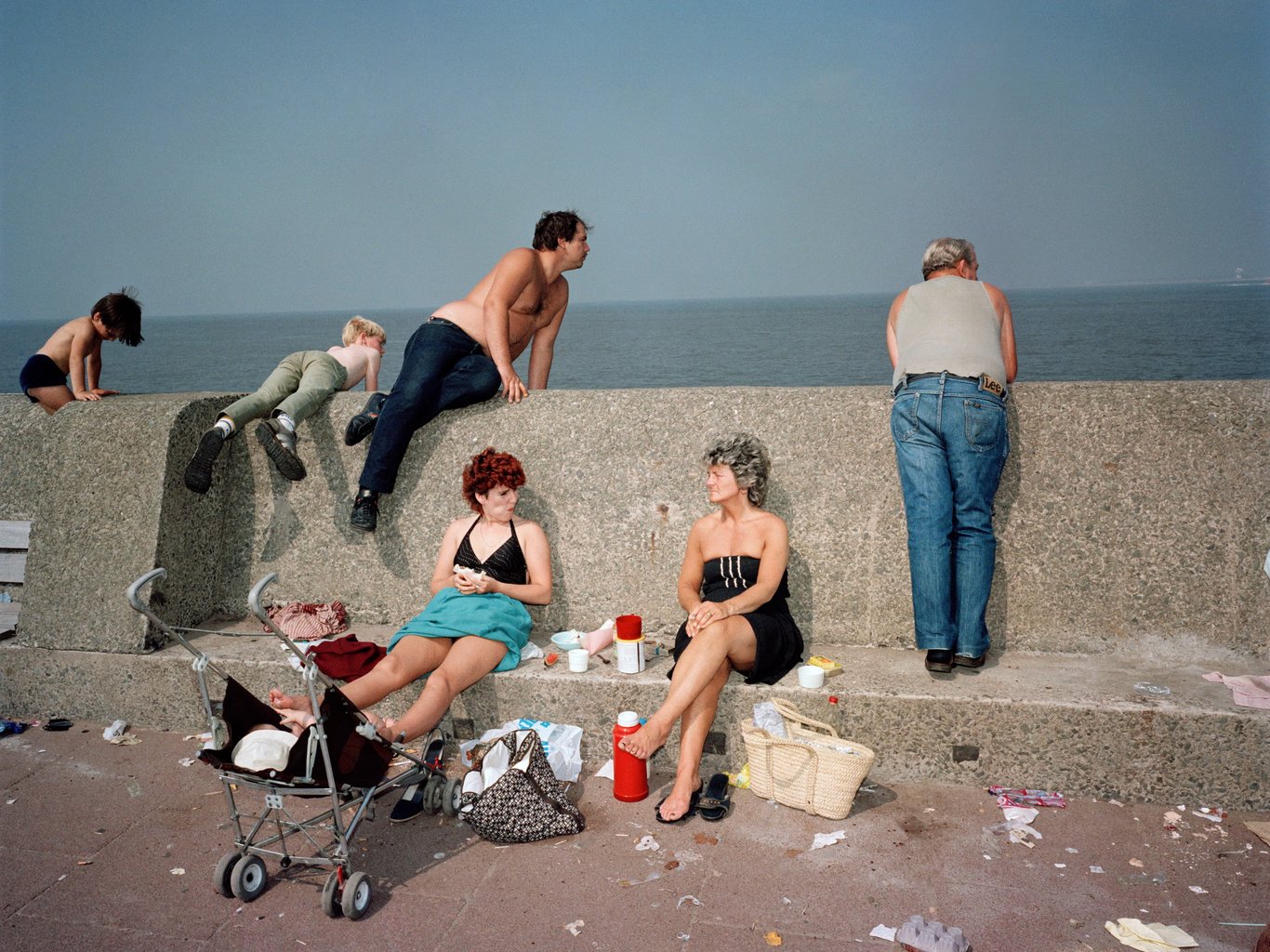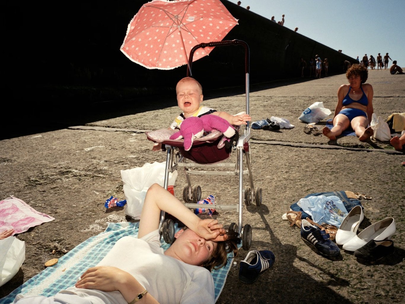帕爾在《最後的度假勝地》中,把鏡頭對準了八十年代初利物浦附近的新布萊頓(New Brighton),一個骯髒破敗的工人階級海邊度假地。刺眼的陽光下,飽和到幾乎發螢光的泳衣、塑膠玩具、垃圾桶和油光水面擠在一起,孩子在混濁的水里玩,父母在旁邊吃東西、曬太陽,誰的身體都顧不上多乾淨。