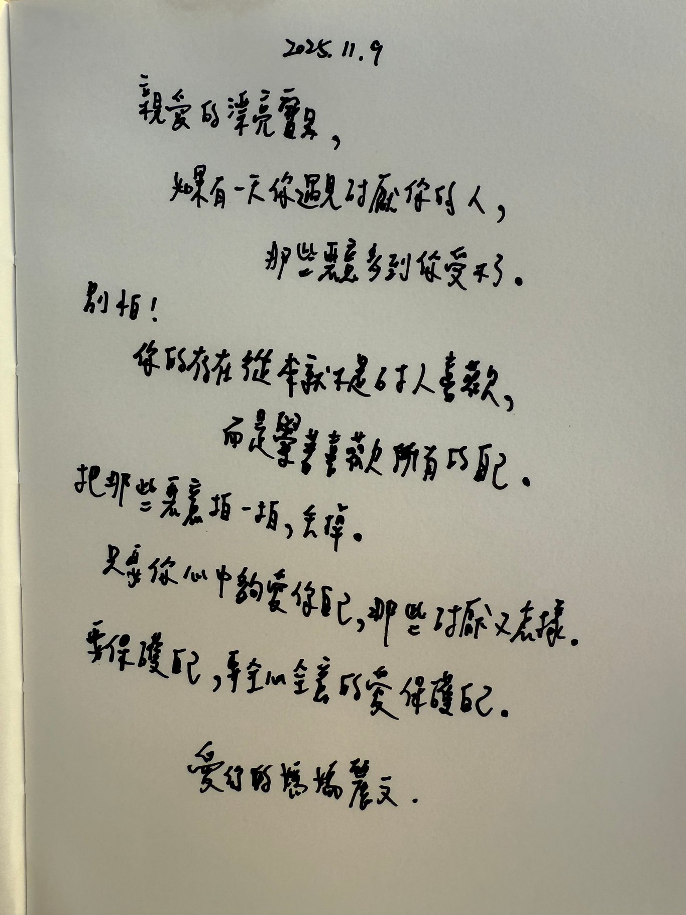 「珍視自己的身心靈,愛自己本來就很困難,不是一句話兩句口號就隨便愛自己,如果你做不到,願這個世界好好哀悼你,因為你自己根本都做不到尊重自己。」