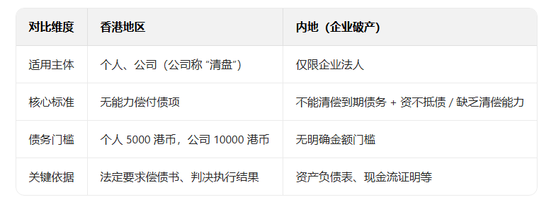 两岸经济往来频繁,不少大陆人士会接触香港的金融与债务事务。但香港与内地的破产制度存在显著差异,内地目前仅企业可破产(深圳试点个人破产),而香港个人与公司均适用破产(公司称“清盘”)制度。其中“无能力偿付债项”作为香港破产的核心判定标准,直接决定着破产程序能否启动。本文就为大陆读者拆解这一关键条件的具体认定规则。