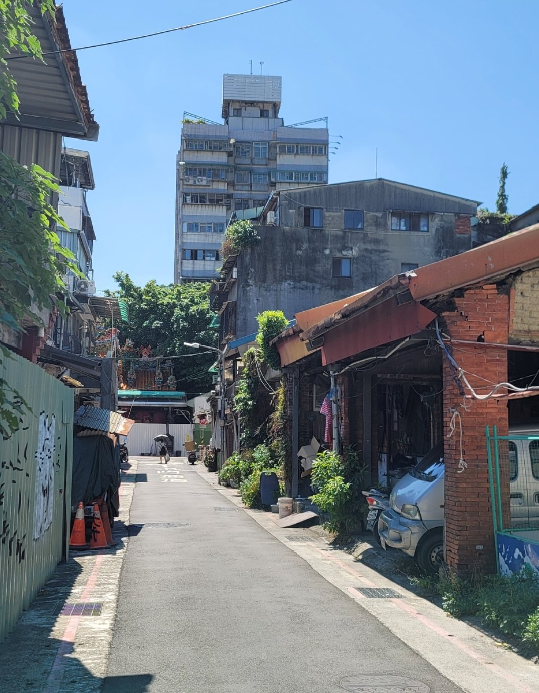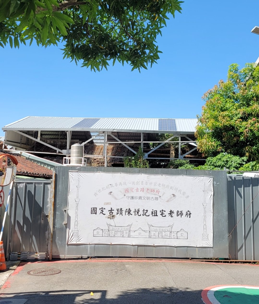從河岸繞出來,有一座天橋,坡度不陡,決定直接騎上去,退到二檔,還是得費點腳力,爬上天橋,越過環河路,下橋後,社子國小前可以還車,台幣20, 很划算。往前右轉社中街,走了約莫500公尺,太陽有點曬,想戴帽子,發覺帽子應該是還放在UBike 的置物籃裡面,忘了拿出來。考慮了一下,決定回去拿帽子。帽子還在,發現這裡是延平北路。剛好是環河北路跟延平北路的交會點。原本想走社中路接到延平北路,想不到自己已經站在延平北路上了。想來一切自有安排。冥冥之中把你拉回正軌? 續往前走,看到一老宅,不知這房子發生什麼事? 想著近來流行的老宅咖啡館,@豈几文 哥應該有興趣? 或許等著拆除改建?改建應該比較有利吧?沿著延平北路六段往台北城內走,走到五段尾接四段,這段路無亭仔腳遮陽,於是左轉敦煌路,發現這一帶叫做老師里。好奇有什麼典故?是出產很多老師嗎?在台北這麼多年,聽都沒聽過,是否該自我檢討,對自己成長土地的無知?再往前走到重慶北路右轉,才發現有一個古建築叫老師府 (陳悅記古宅)。