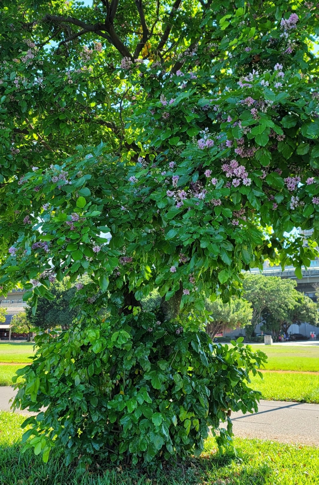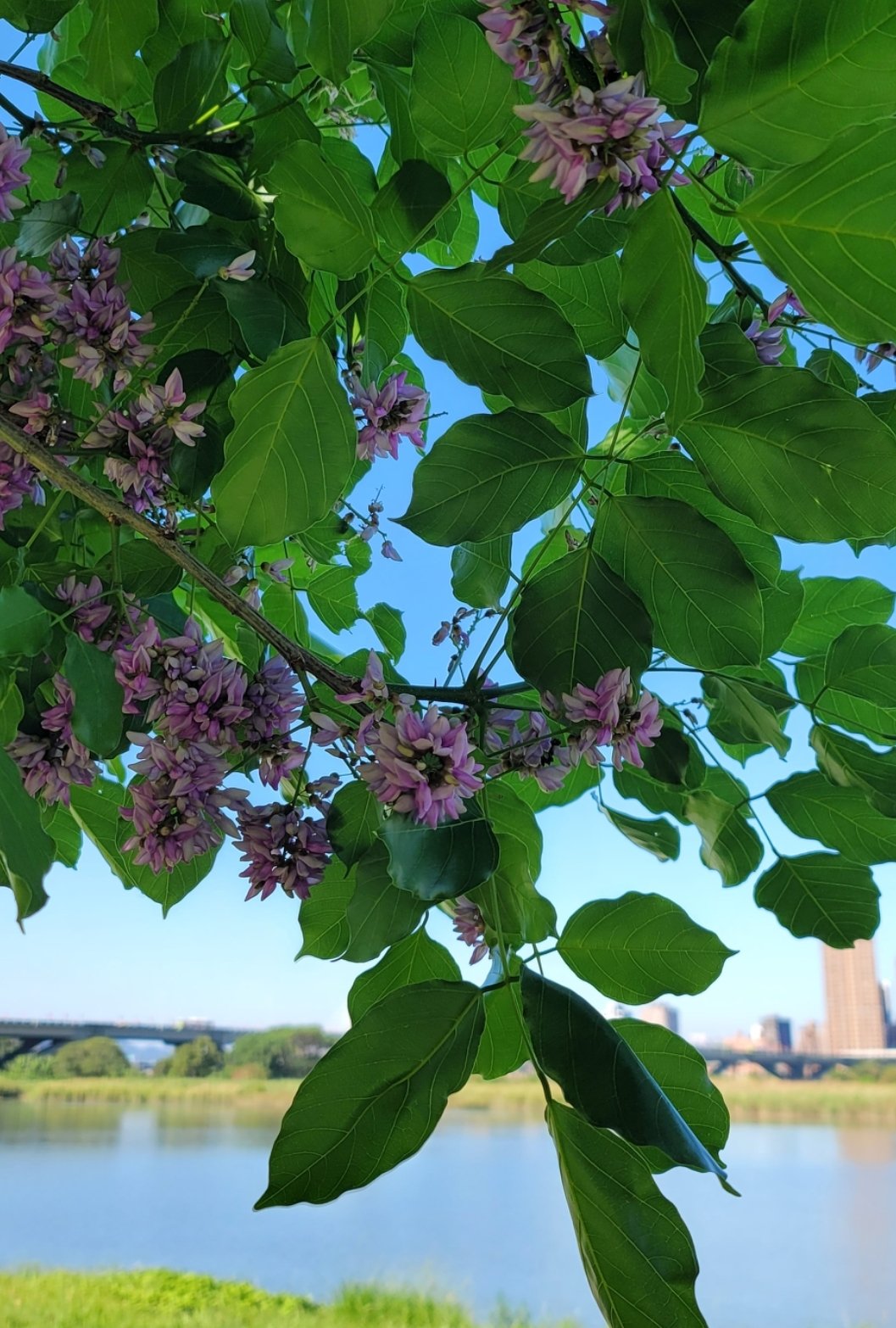 華江橋到大稻埕這一段,經過中興橋,忠孝橋,碰到了水黃皮。水黃皮是台灣的原生種植物,原本生長於水邊、海濱,一年有春、秋兩次花期,主要在春末(約4-5月)及秋季(約9-11月)。 這一段路種了不少水黃皮,現在剛好是盛開的季節,水黃皮花朵呈蝶形,淡紫色,隨風吹拂,落英繽紛。