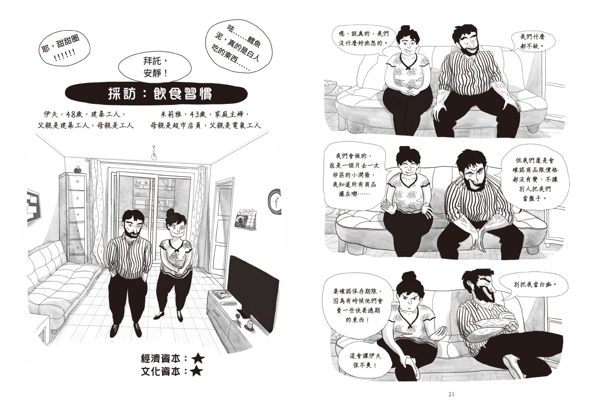 漫畫中不只上述兩種階級的人對於飲食的強烈對比,也有經濟資本高但文化資本低的階級(「新興資產階級」或「新興富裕階層」),經濟資本低但文化資本高(教師、大學教授)等等不同社會階級的人價值觀根深蒂固的差距。