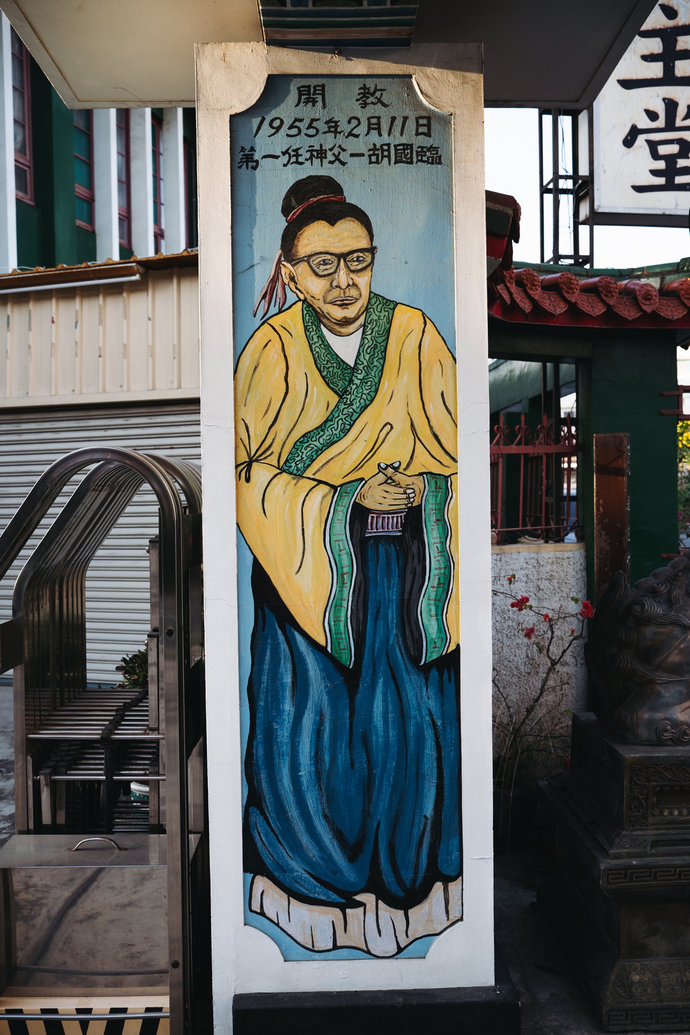 鹽水天主聖神堂山門處畫着兩位牧司,我還是第一次看這種畫法,把他們倆畫成門神。畫風亦是傳統國畫風格,非西洋畫。拜託,出立牌,拜託,我會買。