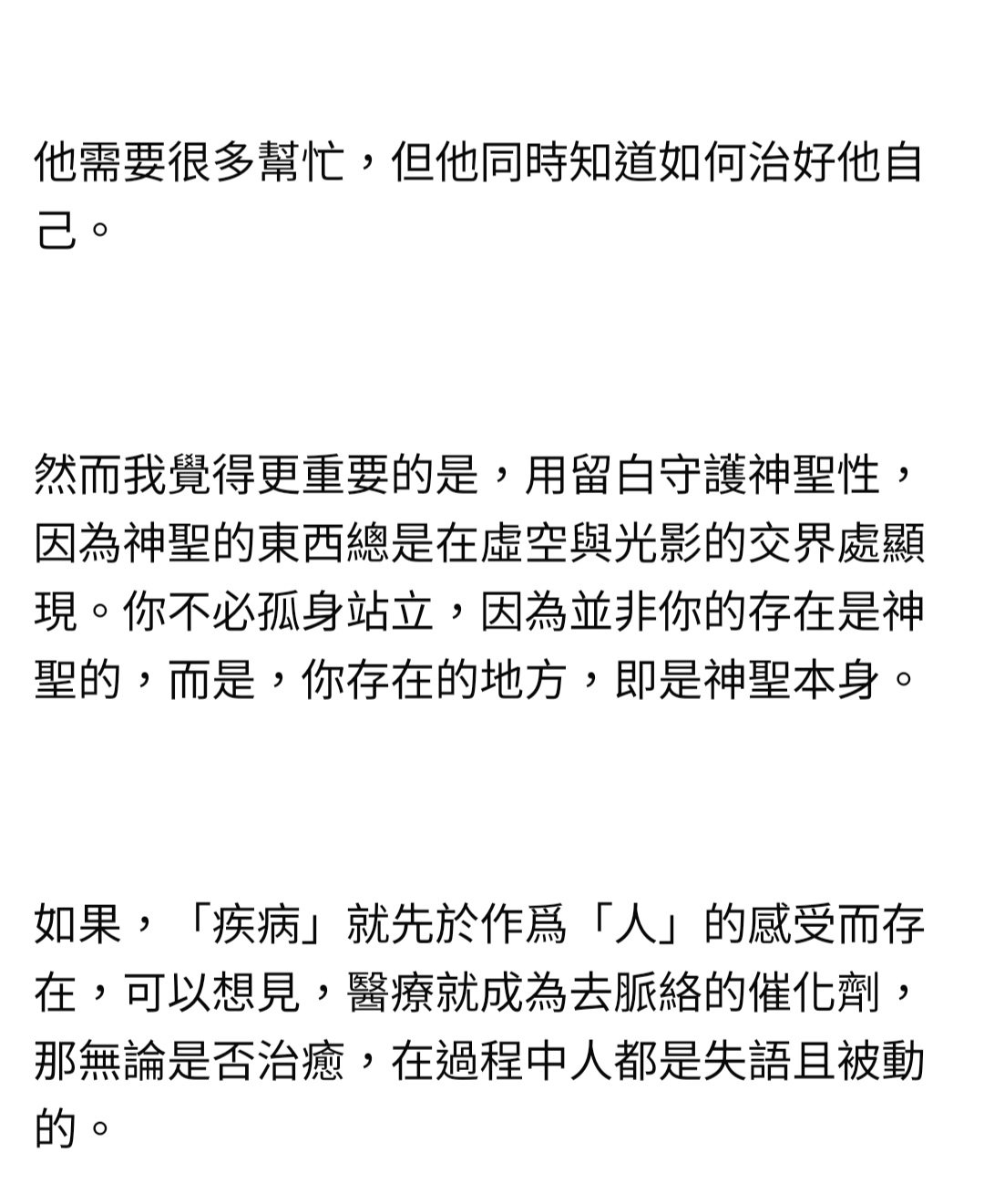 住在精神病房的四天三夜姿瑩 / 方捷·3 月 18 日·IPFS·翻译成简中重鬱與死亡的可能樣態。一下子難以用語言說明兩年多前住院的經驗,但不希望自己身上再帶有為了原生家庭的成份,於是寫下這些文字與選了這張照片。推薦閱讀:林晴晴臉書。 節錄。.CC BY-NC-ND 4.0 授权已推荐到频道:生活事建议频道选择希望推荐到的频道(单选)生活事书音影旅・居性别/爱创作・小说时事・趋势身心灵没有适合的频道不参与频道推荐 (文章将出现在「还有」中)下一步喜欢我的作品吗?别忘了给予支持与赞赏,让我知道在创作的路上有你陪伴,一起延续这份热忱!支持作者支持作者3姿瑩 / 方捷方捷和姿瑩確實不想再工作了.。 請不屬於我們的部份就此停下,謝謝。. 請支持我們兩人在歐洲的生活,謝謝你們。 来自作者相关推荐before that3 篇作品歐洲女性主義組織女性主義組織簡介3 篇作品33