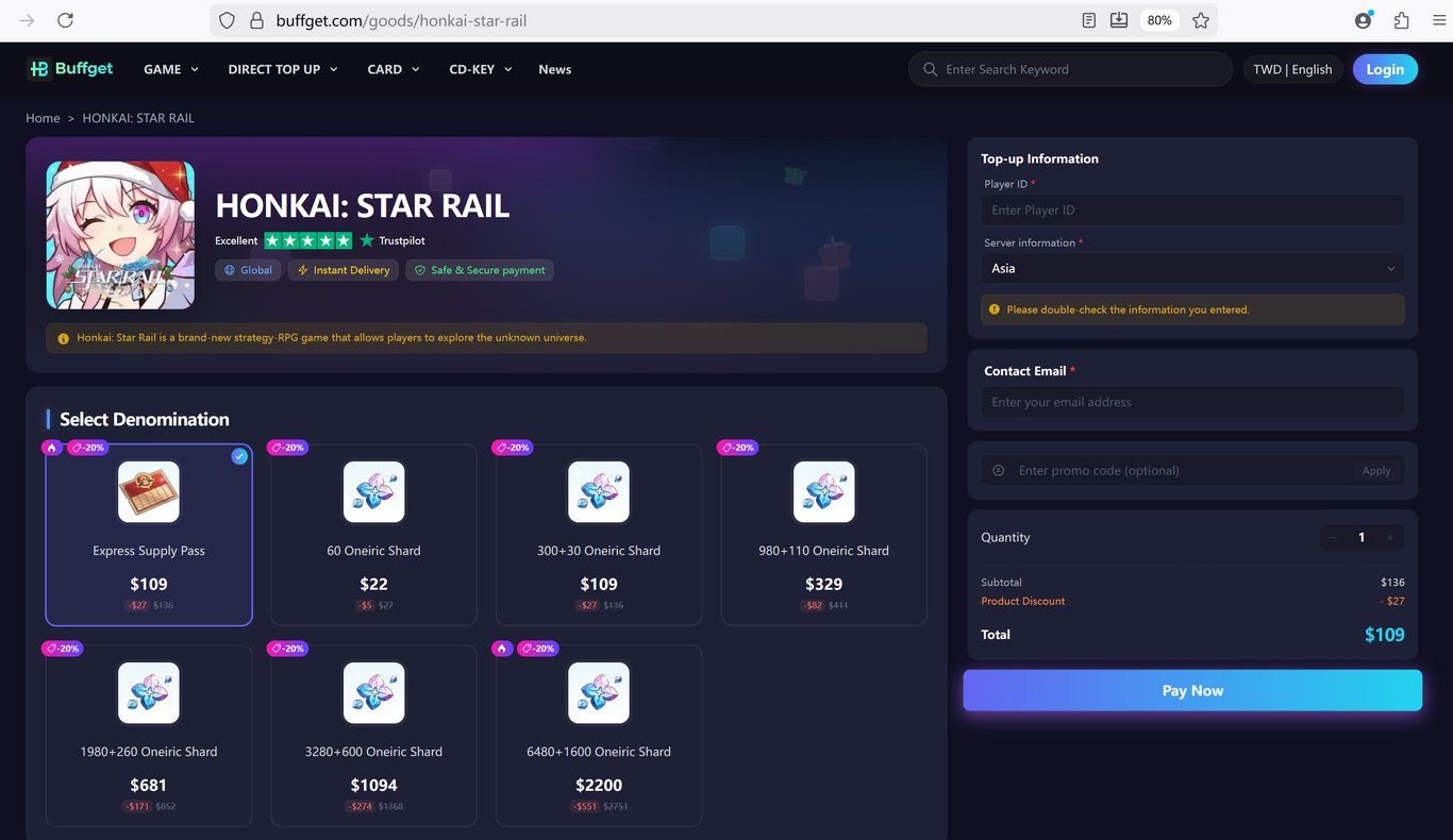 Many veterans use this platform to buy cheap Monochrome (Oneiric Shards). By using buffget, you can secure a consistent 20% discount on your top-ups. This allows you to stretch your budget further, perhaps affording that new skin that matches the Penacony aesthetic perfectly, giving your screenshot that premium edge over the competition.