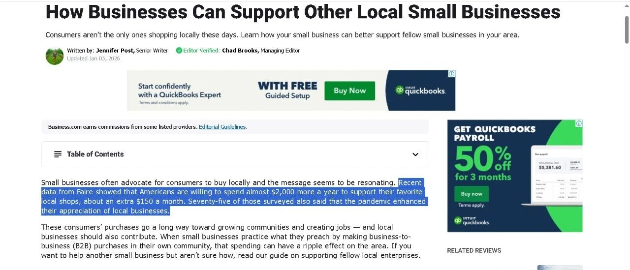 今年1月,business.com 刊文:“Faire 近期的數據顯示,美國人願意每年多花近 2000 美元來支持他們喜愛的本地商店,相當於每月多花約 150 美元。此外,75% 的受訪者表示,疫情讓他們更加珍惜本地企業。” (上圖)
