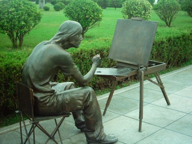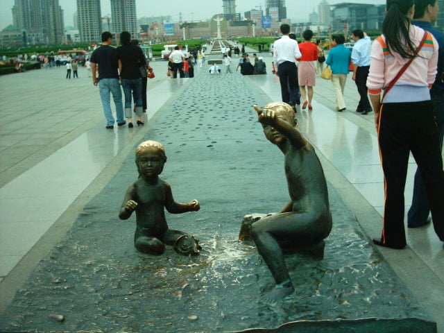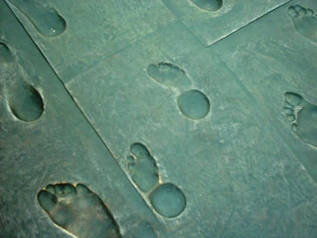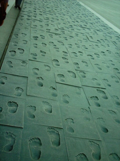 許多銅雕立在廣場,拍了幾張。年輕人在這約會,老年人在這運動。看到廣場上一個百人百足紀念碑,好奇一個看似纏足的腳印。算算真的印了上百人各式各樣的腳,大人、小孩,真新奇!