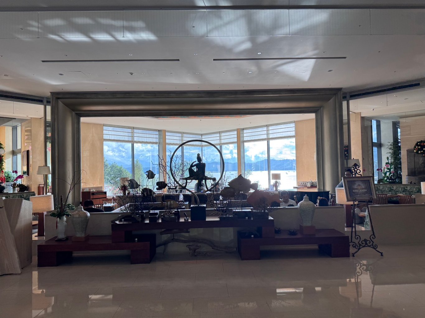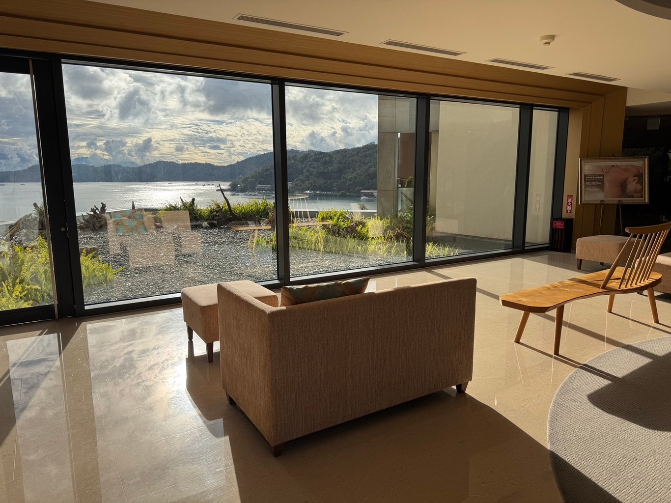 一抵達後就拿好自己的行李跟房卡就可以前往房間了,都不需要再進行其他手續,而一進大廳後步入眼簾的是一尊佛像裝置藝術搭配美景,現場有攝影師拍的落日搭配佛像的照片,搭配後面的景完全是一個自然結合藝術的景象。