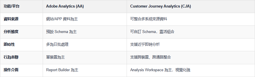 雖然 CJA 與 Adobe Analytics(AA)同樣都屬於 Adobe 的資料分析工具,但其設計定位與使用場景有明顯區隔: