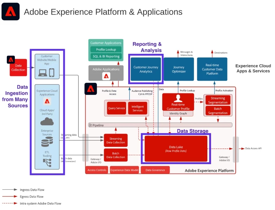 Customer Journey Analytics 並非單一工具,而是 Adobe Experience Platform 生態系中的一環,與 Adobe Journey Optimizer(AJO)與 Real-Time CDP(RT-CDP)互補應用,構成「觀察 → 分析 → 啟動」的數據循環: