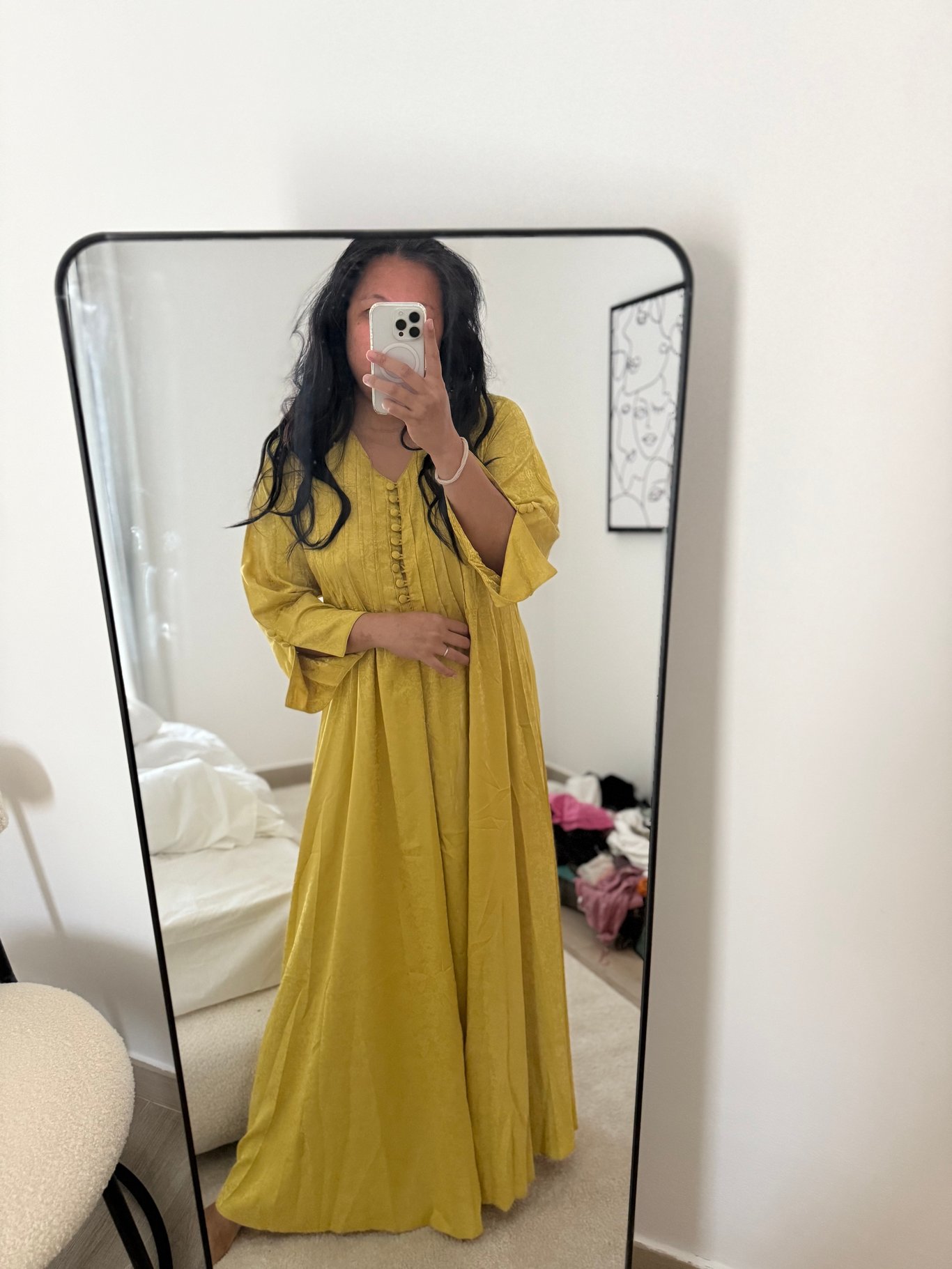 心裡想著要買一件長袍,剛好逛到一家還算可以的長袍店,裡面的花色眾多,摸起來也舒服,最後我試穿了兩三件長袍,最後買了一件舒服芥末黃絲綢長袍,昨天穿出門,舒服極了,根本穿睡衣出門,走起路來非常輕盈意外的不熱,但有一個缺點會常常踩到自己的裙子,長度通常都會遮蓋腳腕,所以非常長,但除了這個缺點之外,一切很好,開始喜歡這種長袍,原來那麼舒服啊。
