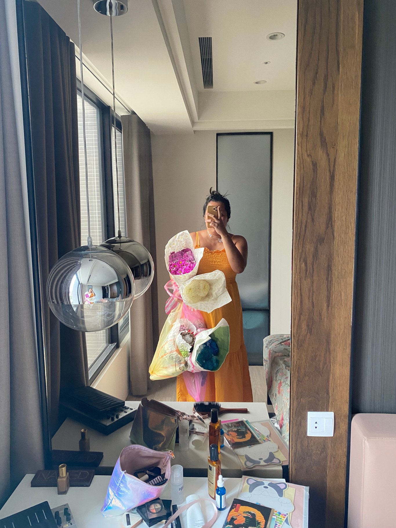 那天去了一家商場的花店,買了幾朵花,大約1200台幣,每個國家的花店姿態不一樣,中東非常喜歡玫瑰花,他們喜歡氣場強大的花束,包裝方式也非常不一樣,鮮豔繽紛的顏色,各種誇張的大花,就連家飾店裡的假花品味也跟我們亞洲區的喜好非常不一樣,特殊的假花,誇張又長又大的金色樹枝,或是亮晶晶的亮片假花,各式牡丹,各種蘭花,非常不一樣。