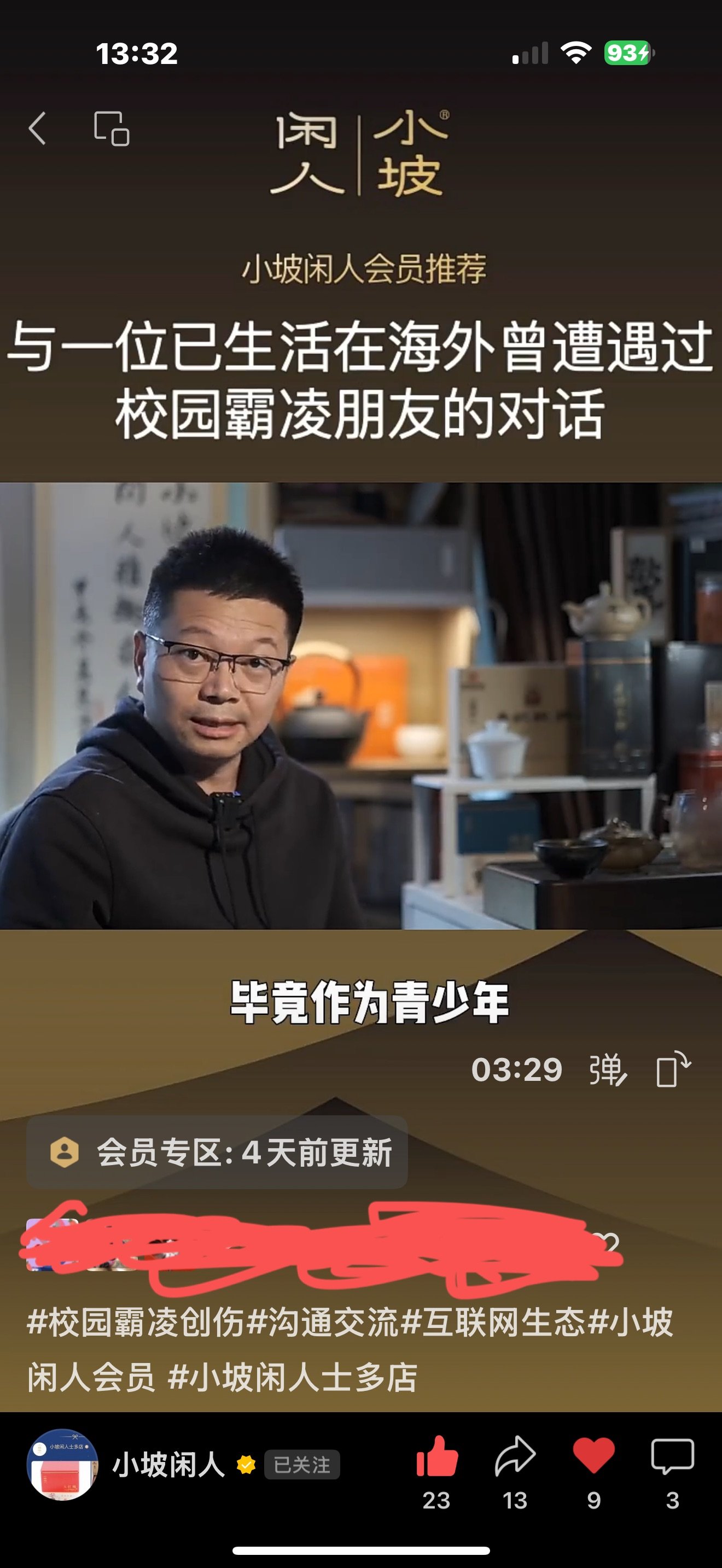 几个小时后,隔大半个地球的我打开这条视频, 那三分多钟的短视频的题目是《与一位已生活在海外遭遇过校园霸凌朋友的对话》,博主说10月已看了我发给他的文章,文章里逻辑、证据链梳理得非常清晰,他非常理解我希望声音并听到、痛苦被看到的这种想法,毕竟青少年时期,遭遇这些事且无处说理,对人一生的影响是巨大的。当时之所以没有马上行动,主要还是因为他是一个常被限流的博主,只有几万粉丝的他,平时还要常常蹭流量。关于这篇校园霸凌的文章,他在没遇到国内某个相关热点爆出来时,很难找到很好的切入点,而现在涉及到关于校园那些不堪事,已很难再热起来。他说,在这些事面前,首先要为自己发声,因为我们不具备为社会发声的资格,哪怕具备这资格的人或机构,他们可能也是受到各种限制的。千万不要做自己够不着或怎样都无法做到的事,更不要做出格的事。视频末,小坡闲人欢迎大家把他当成树洞,说出自己的故事。