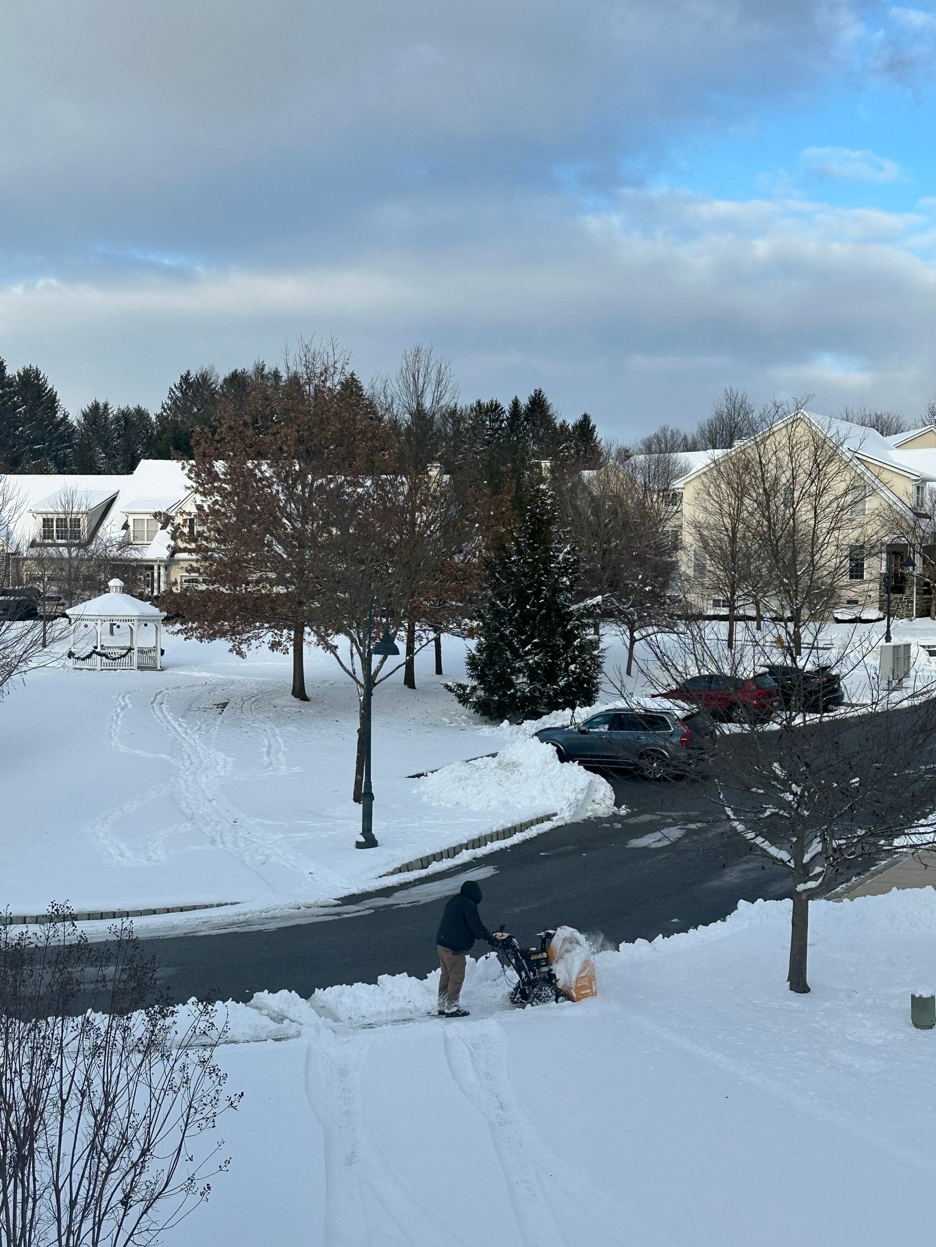 等我们办完事回来,发现物业管理已经把主道路给铲了,辅道和各个业主门前的走道则是在下午的时候物业派了好几个人用人工一铲铲清掉。我问某生是否有怀念自己铲雪的日子,他说有时候还真的想。我们家里的铲雪机都还留着,之前在麻省的时候某生可是每年都用几次。现在来宾州因为没有买自己的house,这些事就交给物业来处理。想想也好笑,居然会想念铲雪的日子,人真是很奇怪的。