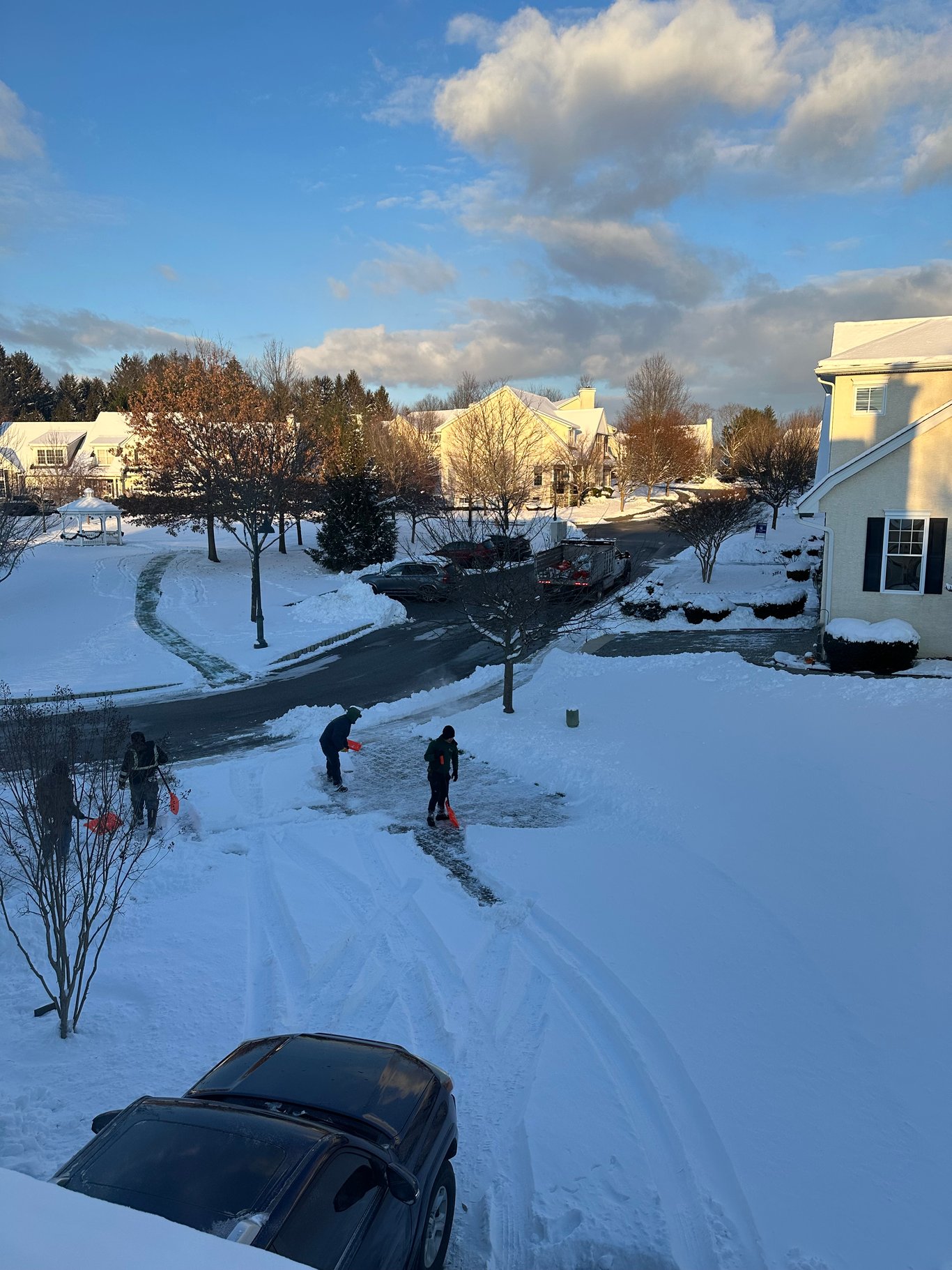 我们小区里的雪有专门的公司来处理,这是我们每个月交的物业费中的一项服务。但是因为我们要出去,某生的车又在户外,他就自己拿出铲子把车旁边的雪给铲到一边。他的车子有四轮驱动,所以在这种气候下压根没问题。把车子上的雪清掉后,他就直接开车从走道上的雪压着出去。