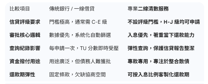 傳統銀行高度依賴環聯(TU)的數據模型。只要您的評分偏低,系統會自動預設您為「高風險」,直接拒絕申請。而專業的二線清數服務則採取「人本導向」的審核方式。審批員更看重的是您「當下」的還款能力,例如您的入息穩定性、現職公司的性質、甚至是您的居住環境。只要能證明現時有穩定現金流,過往的評級瑕疵並非絕對障礙。
