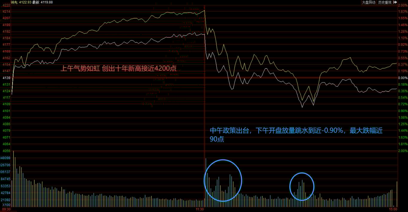 可就在大盘一路气势如虹,连创新高的时候,政策面突然方向变化,中午突然出台的管理层收紧融资杠杆的消息,让市场立刻在下午开盘就回落,如下图: