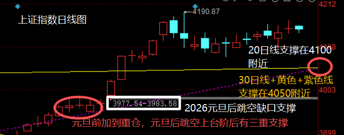 在我们元旦之前的文章:2025最后一个交易日,持股还是持币过年「链接」?着重强调了在元旦之前逢低加仓的策略之后,A股从2026年开始就实现了开门红,之后跳空连续上涨,加速最高到了1月14日上午4190点的最高点。大家都收获满满,信心十足。我也一直没有发出减仓信号,实现高仓位获益。