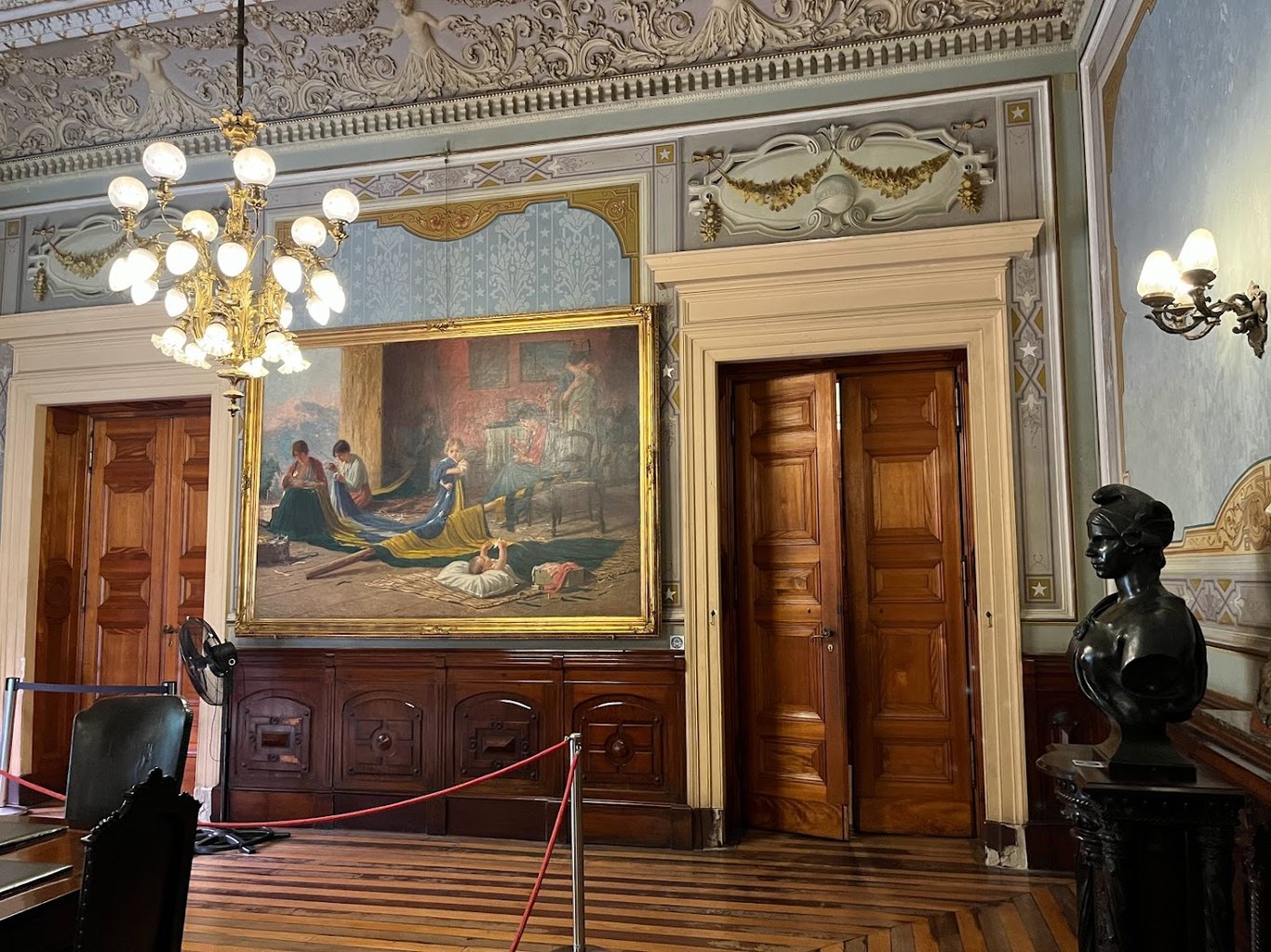 乘地鐵回去,從Glória出站,因走錯方向,盲打誤撞地遇見了免費的共和國博物館Museu da República,又名卡特蒂宮Palácio do Catete,富麗堂皇,大概是從前的總統官邸(1960年代之前里約是巴西首都)。 樓上臥室陳列著瓦加斯(Getúlio Vargas)總統的染血睡袍。 翻查歷史,他1954年在四面楚歌之中,對準心臟槍擊自己身亡,死於任上。 博物館背後是一個長方形大花園,棕櫚參天。