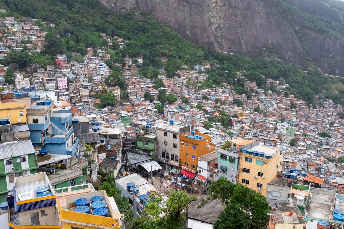 從高處俯視全景,一般住宅外牆不似我想像中那樣組成七彩繽紛的拼盤,多數是磚紅毛坯房,幾乎個個房子有天臺,扛著藍色塑膠大水缸,承接雨季天恩,即使家中裝有自來水也可以節約開銷。 茱莉亞介紹,羅西尼亞有公車線路,有定期收垃圾服務;房間租金越往山下越貴。 彷彿記得她說靠近山腳的單間,租金要1200雷亞爾一個月,近山頂的則減半或更少。 她指給我們看緊鄰本區的高層樓盤、貴族學校,和人人可享用的公共康樂設施。