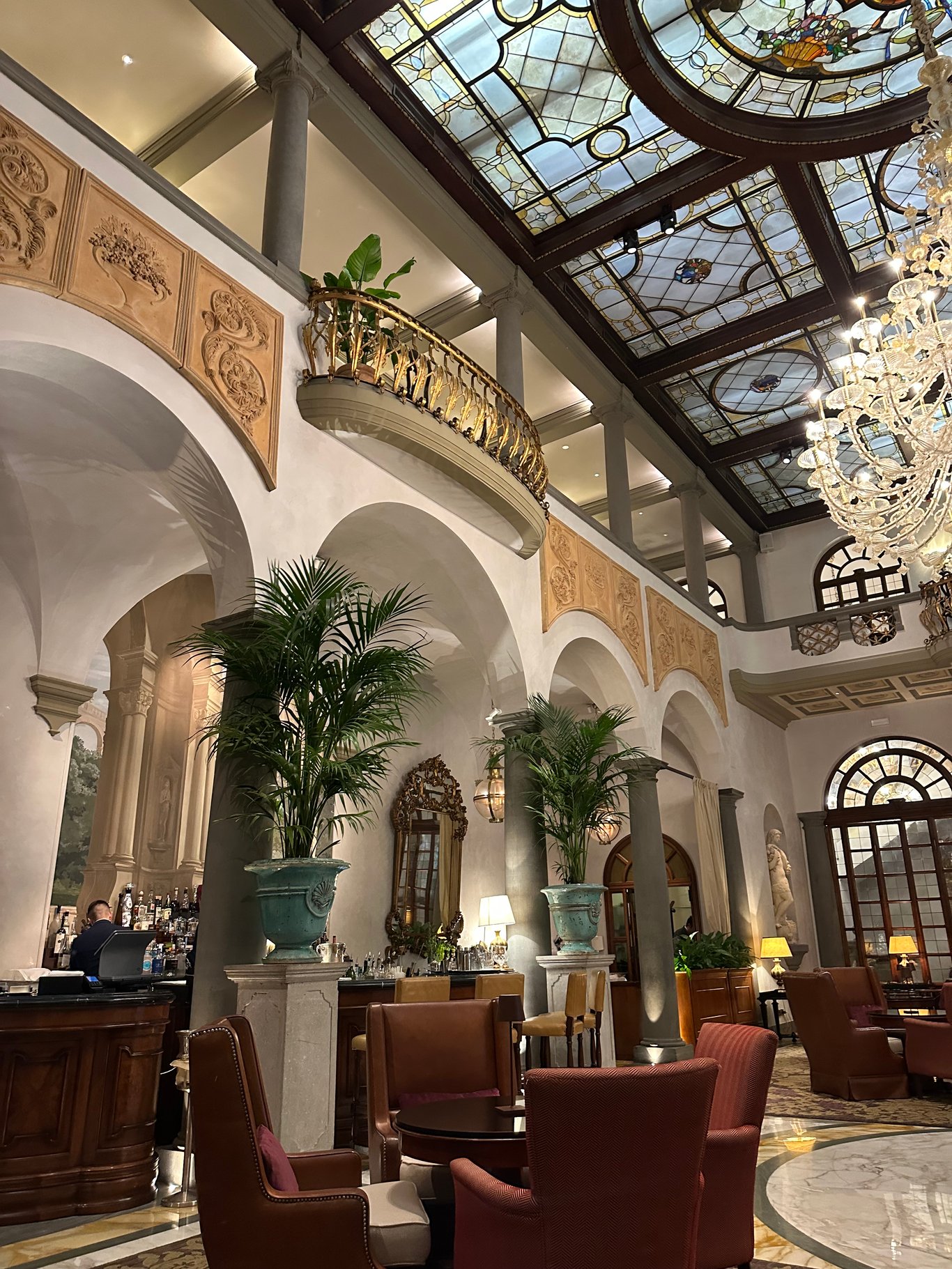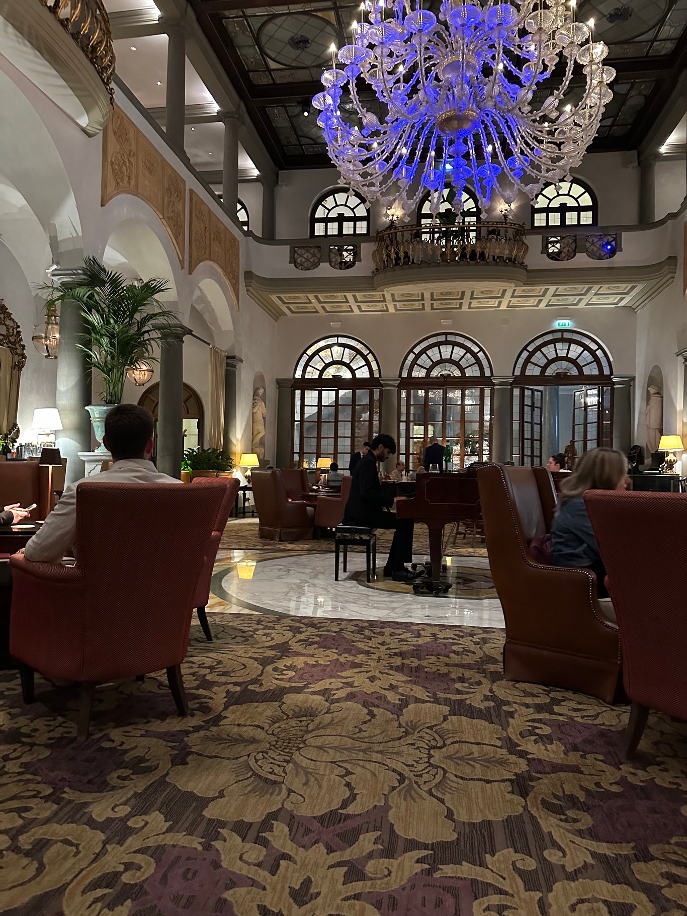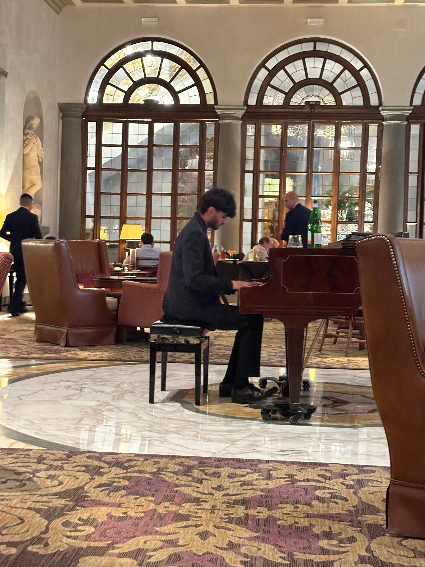 酒店的酒吧加餐厅就在一楼,这装饰真是豪华。超级喜欢他们的屋顶的琉璃装饰,很庄重,豪华。大厅的中间有部钢琴,每天晚上都有专人从头到位都现场表演。弹完一曲,大家都会鼓掌,他会很有礼貌地起立来跟大家点头致谢。音乐很美,这么好的气氛,难怪某生每天都要到大厅去消费听音乐了。