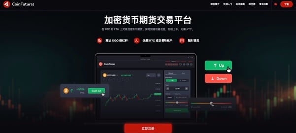 如果想考驗自己對加密貨幣投資眼光,也可使用CoinFutures,這是一個綜合表現優秀的加密貨幣期貨交易平臺,主打無需KYC、免註冊帳戶即可交易,並提供模擬真實市場波動的遊戲化交易體驗。使用者可即時預測比特幣、乙太幣等主流幣種的價格走勢,並選擇做多或做空,最高可使用達1,000倍的杠杆,亦支援止盈與止損設置。雖然平臺不涉及實際加密資產,市場資料為模擬生成,但其高靈活性與免驗證的設計,對短期預測型交易者而言具吸引力。平臺也支援隨時提領收益,操作門檻極低。