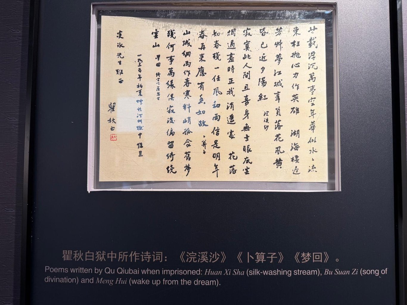 慢步來到瞿秋白紀念館,踏入一刻,就聽到《國際歌》。跟日常聽到的版本不同,這裡播放的是鋼琴版,讓人平靜地回顧瞿秋白不平凡的一生。他在人生的最後階段,視自己為文人,在這個展館裡,確實有不少痕跡。例如,他手抄贈予魯迅的《雪意》–「雪意淒其心惘然,江南舊夢已如煙。天寒沽酒長安市,猶折梅花伴醉眠。」又如他在汀州獄中所寫的《浣溪沙》–「廿載浮沉萬事空,年華似水水流東,枉拋心力作英雄。湖海棲遲芳草夢,江城辜負落花風,黃昏已近夕陽紅。」站在這些詩詞前,無不感到唏噓。畢竟,他曾在給當時還是未婚妻王劍虹的信裡寫過「萬郊怒綠鬥寒潮,檢點新泥築舊巢。我是江南第一燕,為銜春色上雲梢。」他留下《多餘的話》、一些政論、一些散文,還有一些詩詞。他是革命家、文人,也是一位詩人。
