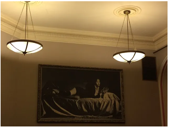 昏暗的燈光下,牆面上掛畫中的女人透出一股悠哉與閒適,