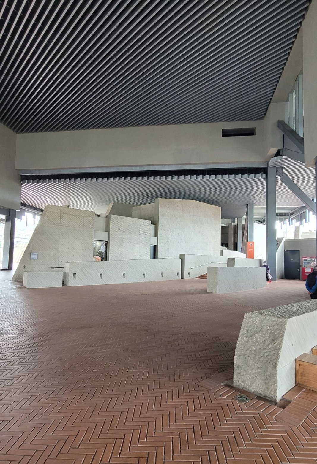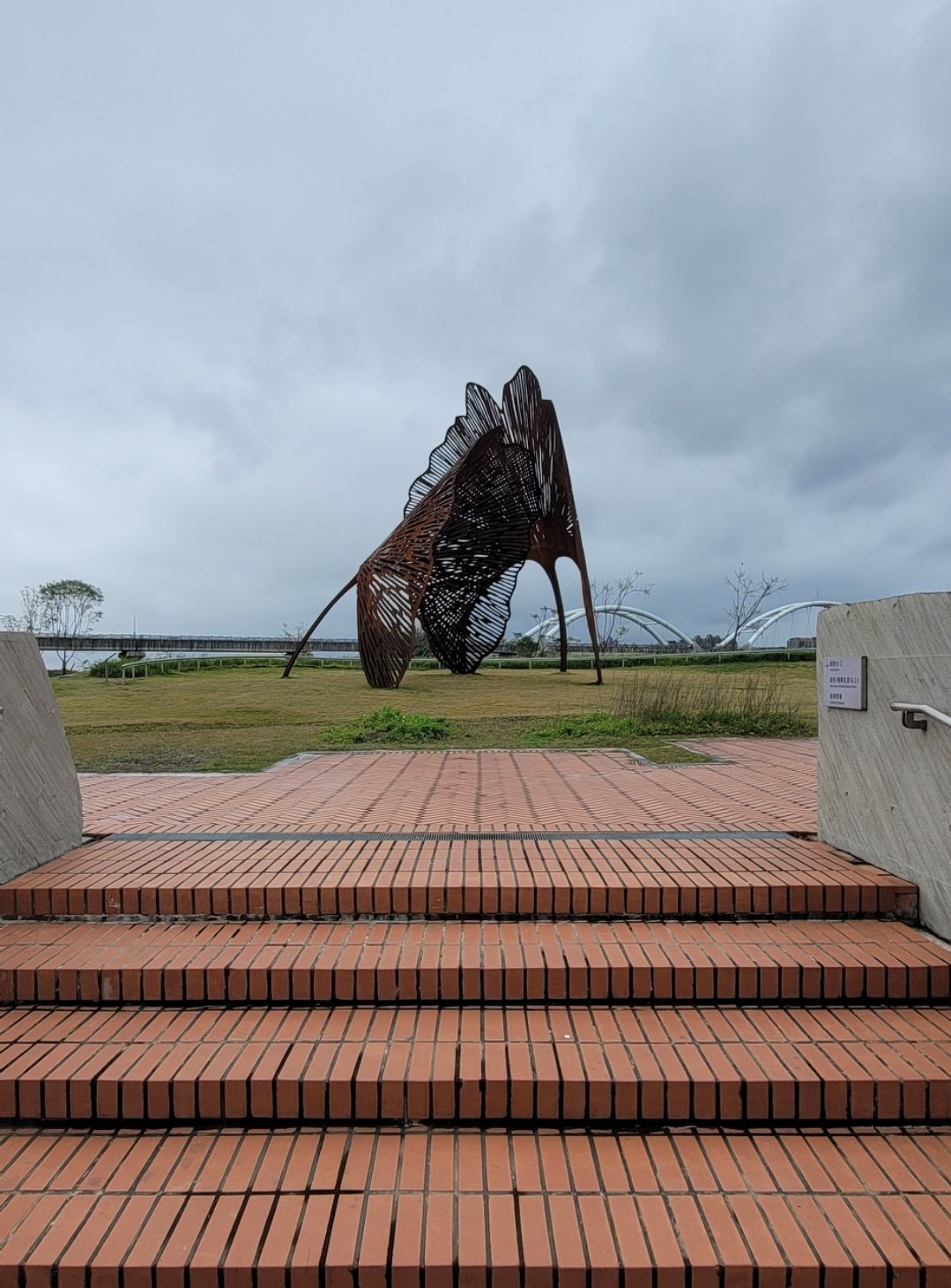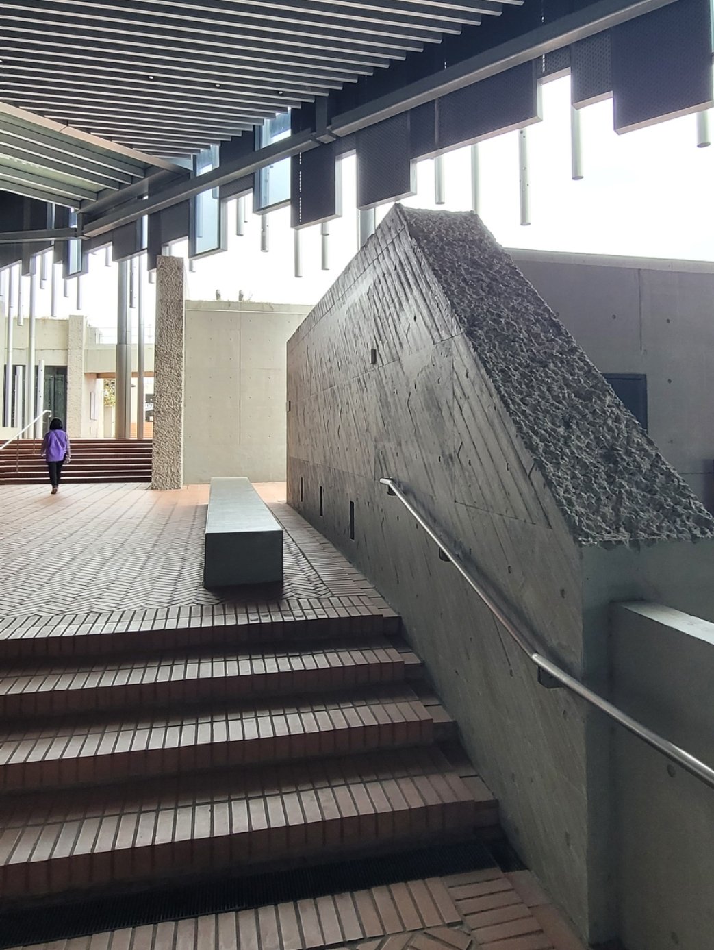 一直想來看看新北市美術館,今天終於成行。坐火車到鶯歌火車站下車,出站後依循指標,過馬路(文化路) 步行經由捷運三鶯線鶯歌站,不到五分鐘,ㄧ座具有國際級水準的漂亮美術館,矗立在我的眼前。今天雖然是星期六,但沒看到什麼人。早上10點多,偌大的空間,只見一小群資深民眾,在旁邊做運動。大概是天候不佳,或是換展期間?還是很多人還不知道?或是郊外的美術館吸引力不夠?我想都有吧? 走到服務中心,幸運的碰到10:30 有免費導覽,大約30分鐘的園區與建築導覽,非常值得參與。另兩點半有當期展覽的導覽。建議有時間的話,一定要參與導覽。以下小弟的參觀走讀及部分導覽介紹。