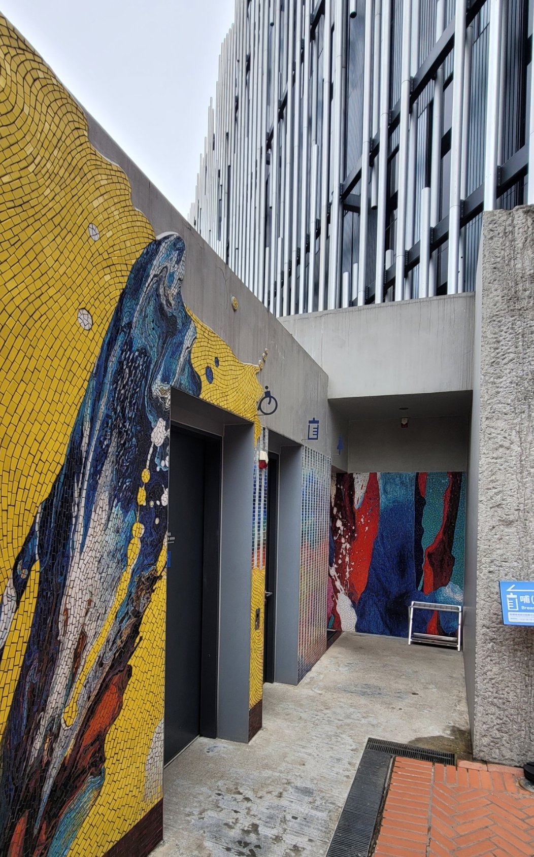 廁所也有設計,牆上是馬賽克作品,使用抽象的概念設計,性別友善廁所外是 ‘’形色與色‘’ ,概念如藍色一杯水加入不同顏料隨意調製,再潑灑出去,呼應到紅色地磚,紅色地磚代表人流的意思,加上水潑灑出去有人流人潮的感覺想法。女廁也有一幅馬賽克作品,"島嶼路徑" 為鶯歌古地圖結合現代GPS的作品。