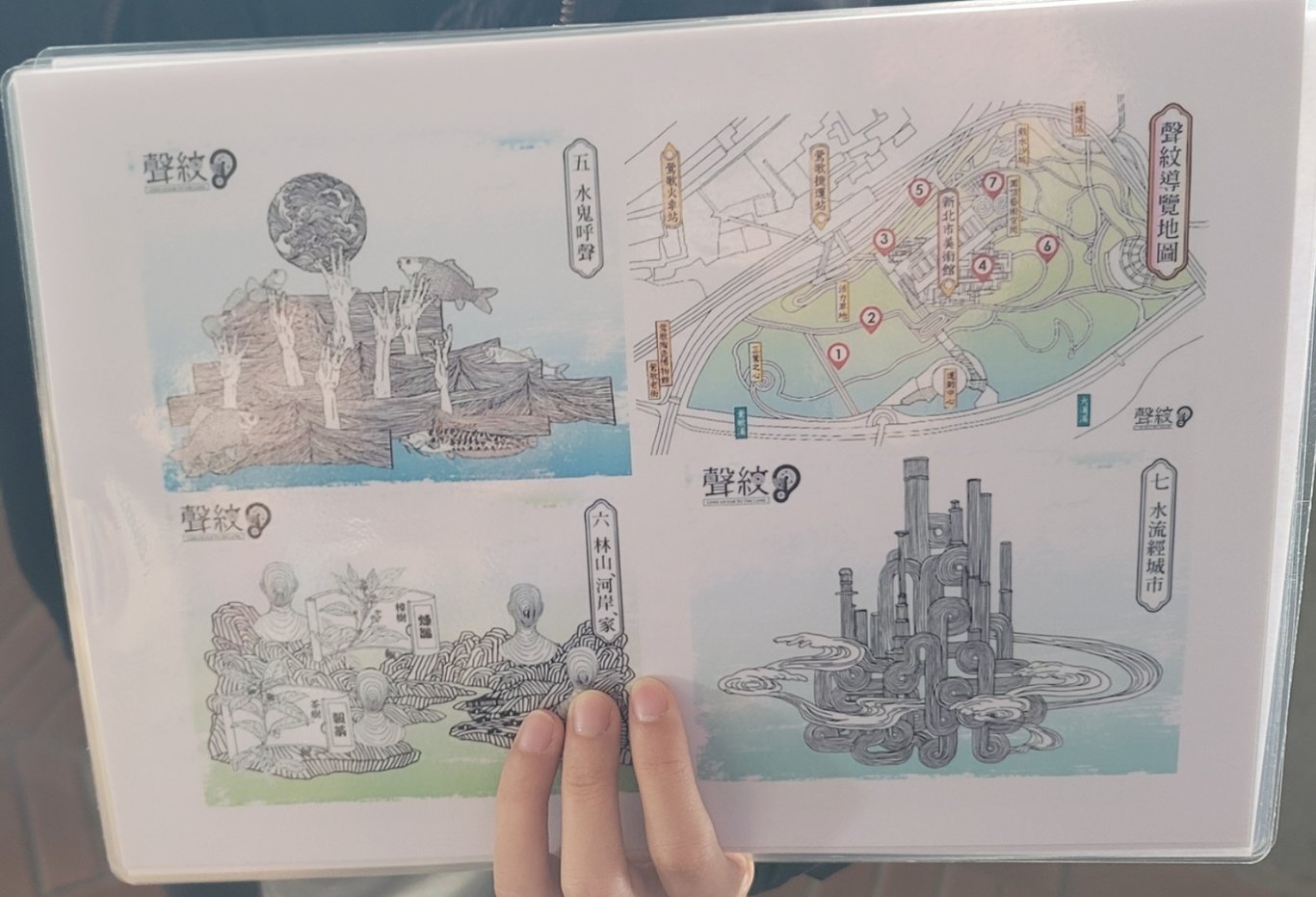 園區內總共有七個聲音作品,名稱叫做 ‘’聲紋‘’,類似語音導覽的作品。有兩個版本,一個是導覽版上的QR code, 掃描後會聽到融合文史資料,環境資料,是一種透過參與,身臨其境的解說。另一個版本是官網上的版本,會跟現場的不一樣,線上的版本,點進去會更像紀錄片。現場QR Code 的版本則比較像融合現場的小故事 。有原始資料,分佈在整個戶外園區。如新美居所的聲紋,是水鬼最後變成城隍爺的故事。