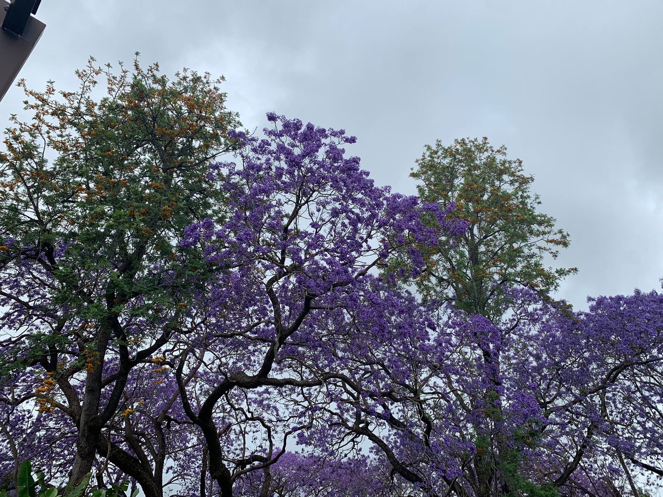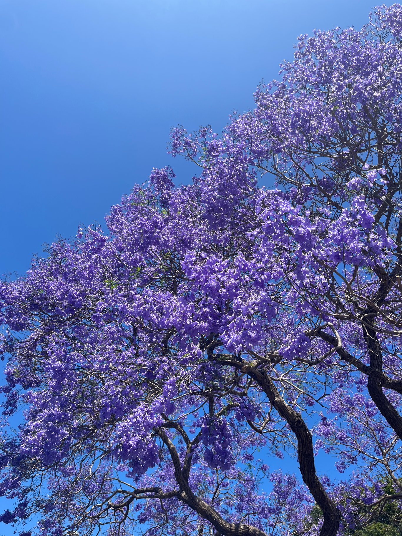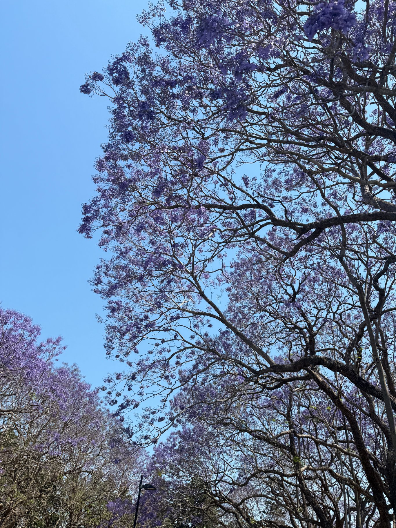 第一次親眼看到藍花楹,是在3年前的10月底,在一所大學門口前。當天天氣不太好,陰雨連綿。所以只拍了張照片就走了。朋友有點失落,和我保證「天氣好的時候,真的很美、很夢幻」。我其實沒有太大期待,只是好奇天氣晴朗時的藍花楹是不是她口中說的那麼美。