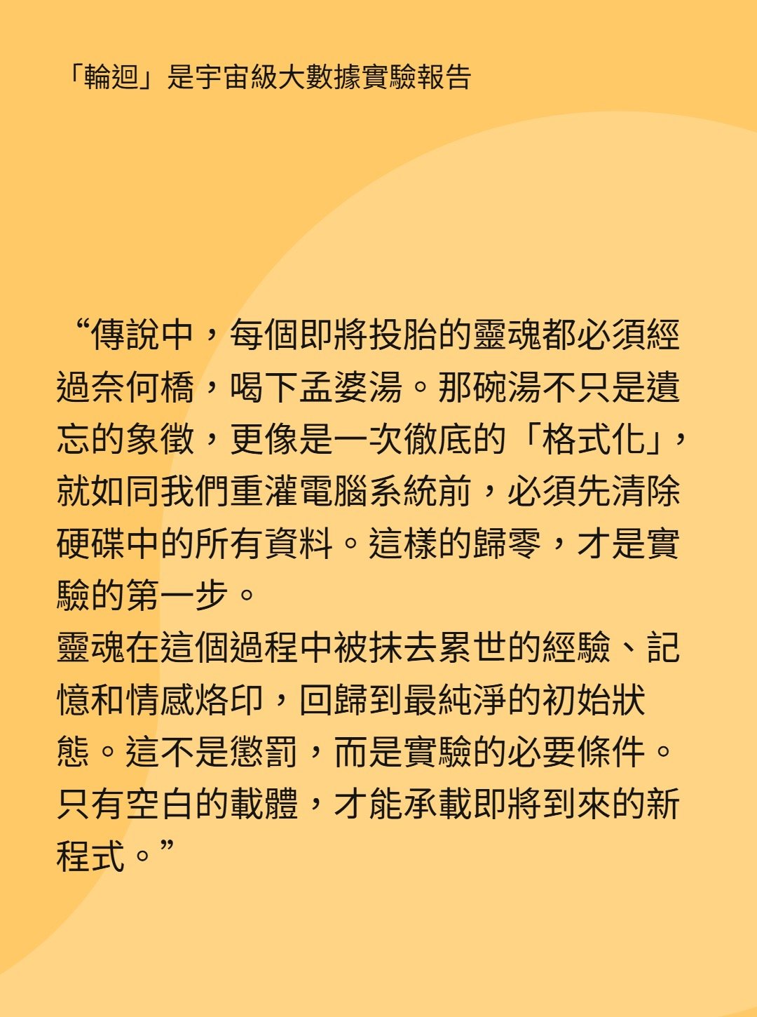 傳說中,每個即將投胎的靈魂都必須經過奈何橋,喝下孟婆湯。那碗湯不只是遺忘的象徵,更像是一次徹底的「格式化」,就如同我們重灌電腦系統前,必須先清除硬碟中的所有資料。這樣的歸零,才是實驗的第一步。