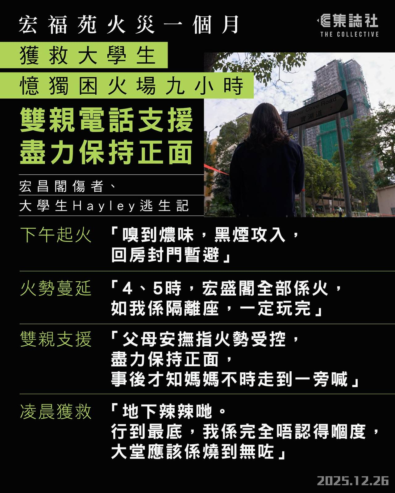 大埔宏福苑五級火,造成 161 死、79 傷。過去一個月,本來安居樂業的居民,變成流離失所的災民。最先起火的大廈,宏昌閣最少 70 人罹難。居於中層的大學生 Hayley向《集誌社》憶述,上月 26 日,孤身困於火場逾九小時的經過,是雙親在電話中盡力保持正面安撫,令她支持下去。事後她才知道,那一夜,在話筒另一端的媽媽,不時走到一旁哭泣。