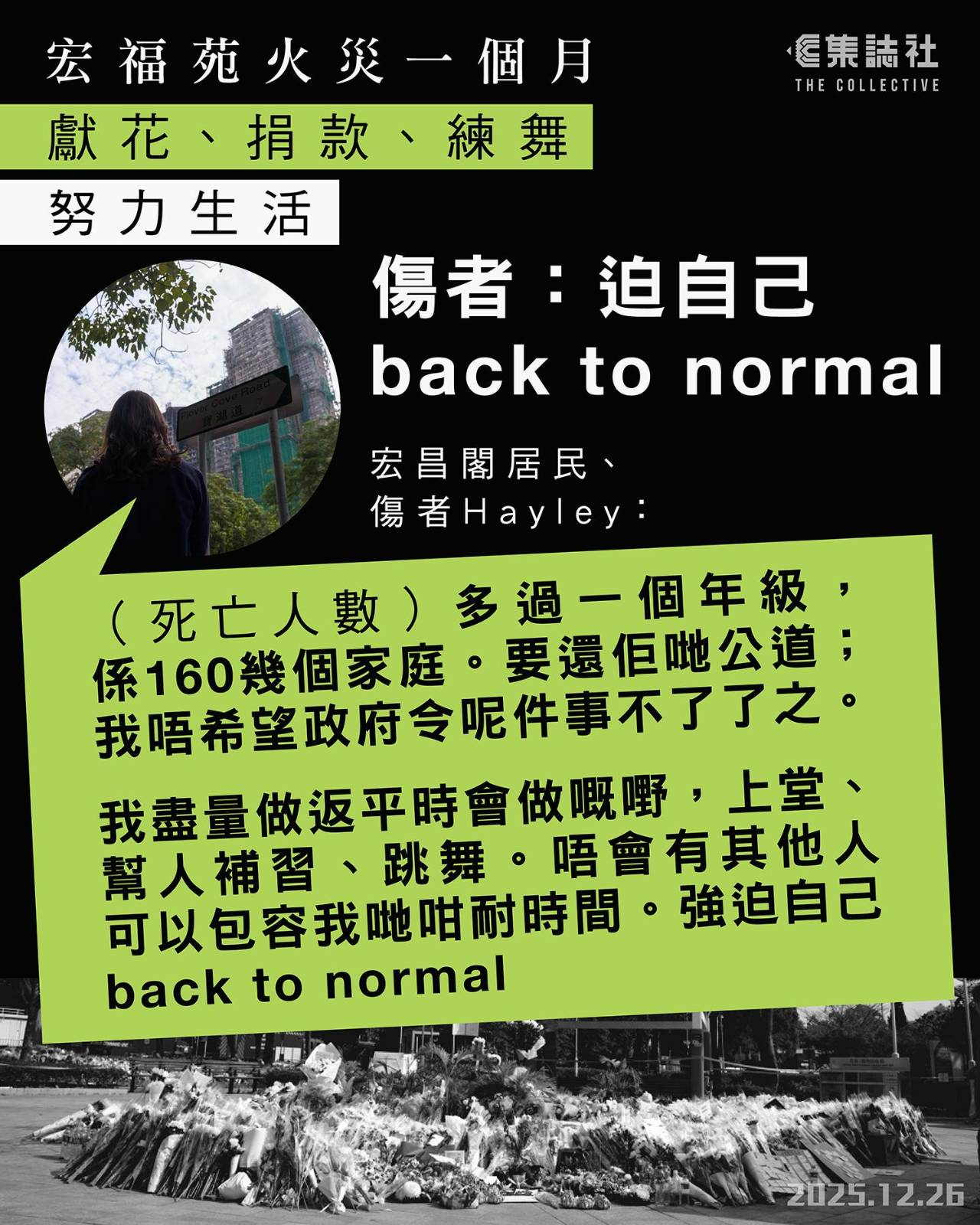 從火場回到現實,她期盼真相早日水落石出。這一個月,她盡力「Back to normal」,明白生活仍要繼續。獲救後,她選擇重返現場獻花、捐款,只因她相信,「唔會有其他人可以包容我哋咁耐時間」。