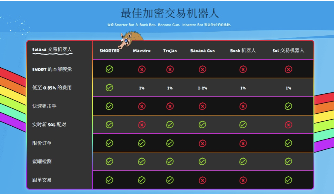 問題來了:為什麼要用 Snorter?難道其他 Telegram 交易機器人沒有這些功能嗎?確實,市場已經很擁擠,頭部玩家包括:Maestro:最早普及 TG 交易,以多鏈覆蓋和訂閱模式聞名;Banana Gun:因高速狙擊和收益分成代幣而出圈;Trojan:專注 Solana,以閃電般的執行力和返現獎勵站穩市場,甚至無需代幣。
